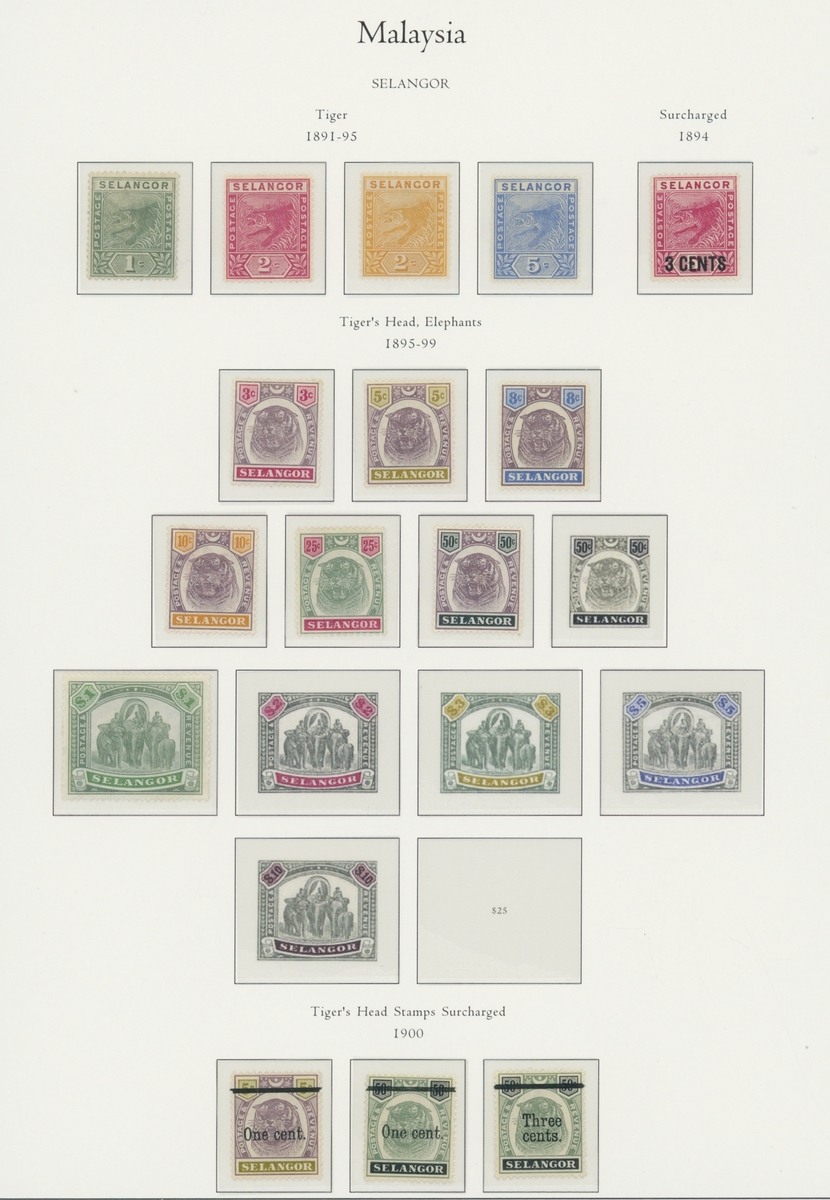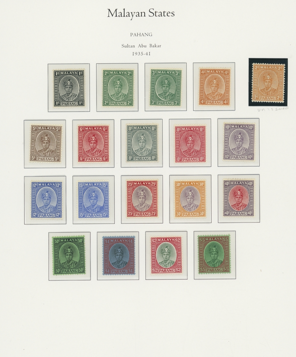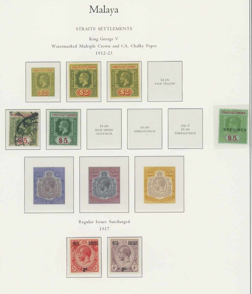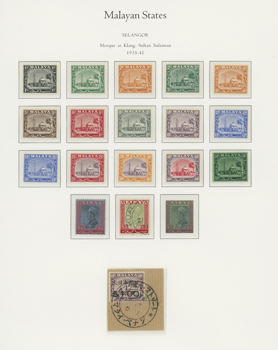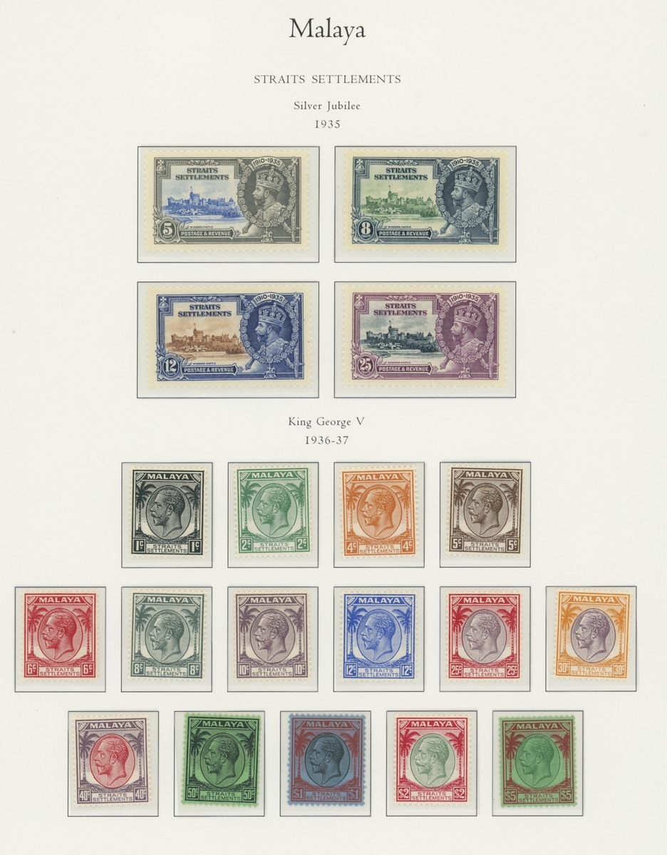 1912-1935 mostly mint collection on album leaves, comprising Straits Settlements, Malayan States and Federated Malay States, including 1912-23 £5 mint and specimen, 1921-33 set to $5, 1936-37 set; Johor 1891-94 set, 1894 surcharges, 1896-99 set, 1922-40 values to $5, 1912-21 set to $2, 1921-32 set less 10c, 1922 Malaya-Borneo Exhibition range; Kelantan 1911-15 set to $5, 1921-28 set; Negri Sembilan 1935-41 set; Pahang 1897 Kuala Lipis 3c. provisional bisected diagonally and tied to small piece, 1935-41 set; Perak range of overprints, 1892-95 set, 1895-99 values to $2, 1935-37 set to $1, plus 1889 officials set to 8c; Selangor 1891-95 set, 1895-99 values to $1, 1935-41 set to $1, plus $2 used; Sungei Ujong 1891-94 set, 1910-19 values to $1, 1921 $5, 1922 Malaya-Borneo Exhibition set to $1, 1921-38 values to $5; 1900 Federated Malay States values to $2, 1922-34 set to $2. A good range, generally good to fine.