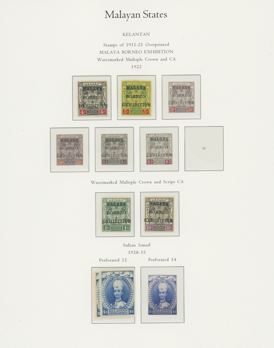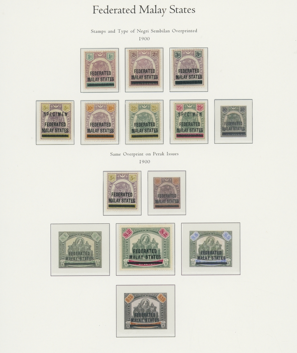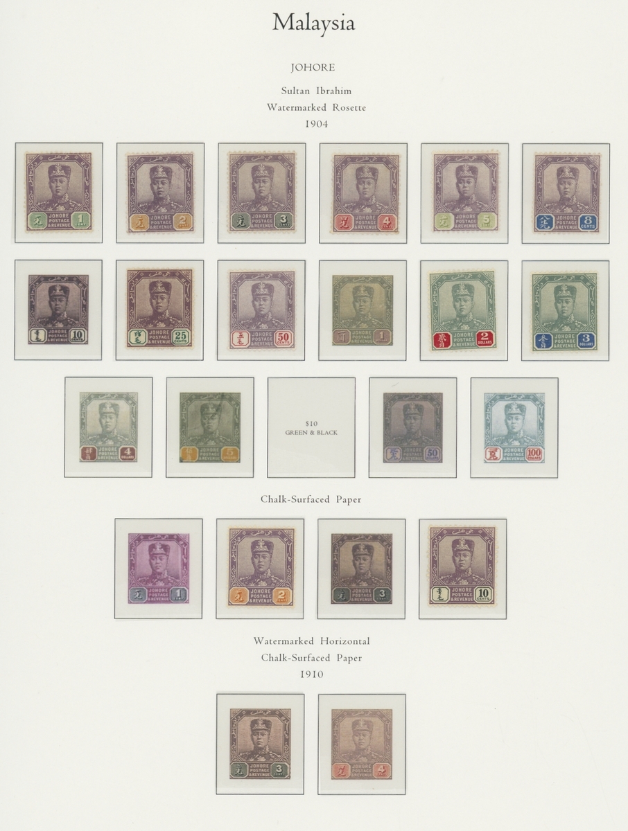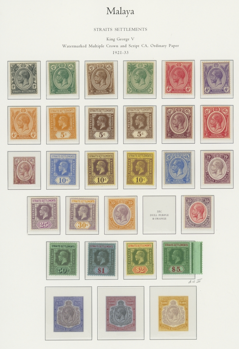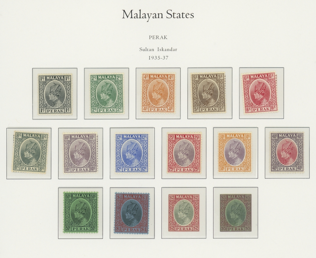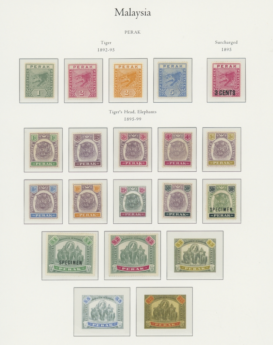 1912-1935 mostly mint collection on album leaves, comprising Straits Settlements, Malayan States and Federated Malay States, including 1912-23 £5 mint and specimen, 1921-33 set to $5, 1936-37 set; Johor 1891-94 set, 1894 surcharges, 1896-99 set, 1922-40 values to $5, 1912-21 set to $2, 1921-32 set less 10c, 1922 Malaya-Borneo Exhibition range; Kelantan 1911-15 set to $5, 1921-28 set; Negri Sembilan 1935-41 set; Pahang 1897 Kuala Lipis 3c. provisional bisected diagonally and tied to small piece, 1935-41 set; Perak range of overprints, 1892-95 set, 1895-99 values to $2, 1935-37 set to $1, plus 1889 officials set to 8c; Selangor 1891-95 set, 1895-99 values to $1, 1935-41 set to $1, plus $2 used; Sungei Ujong 1891-94 set, 1910-19 values to $1, 1921 $5, 1922 Malaya-Borneo Exhibition set to $1, 1921-38 values to $5; 1900 Federated Malay States values to $2, 1922-34 set to $2. A good range, generally good to fine.