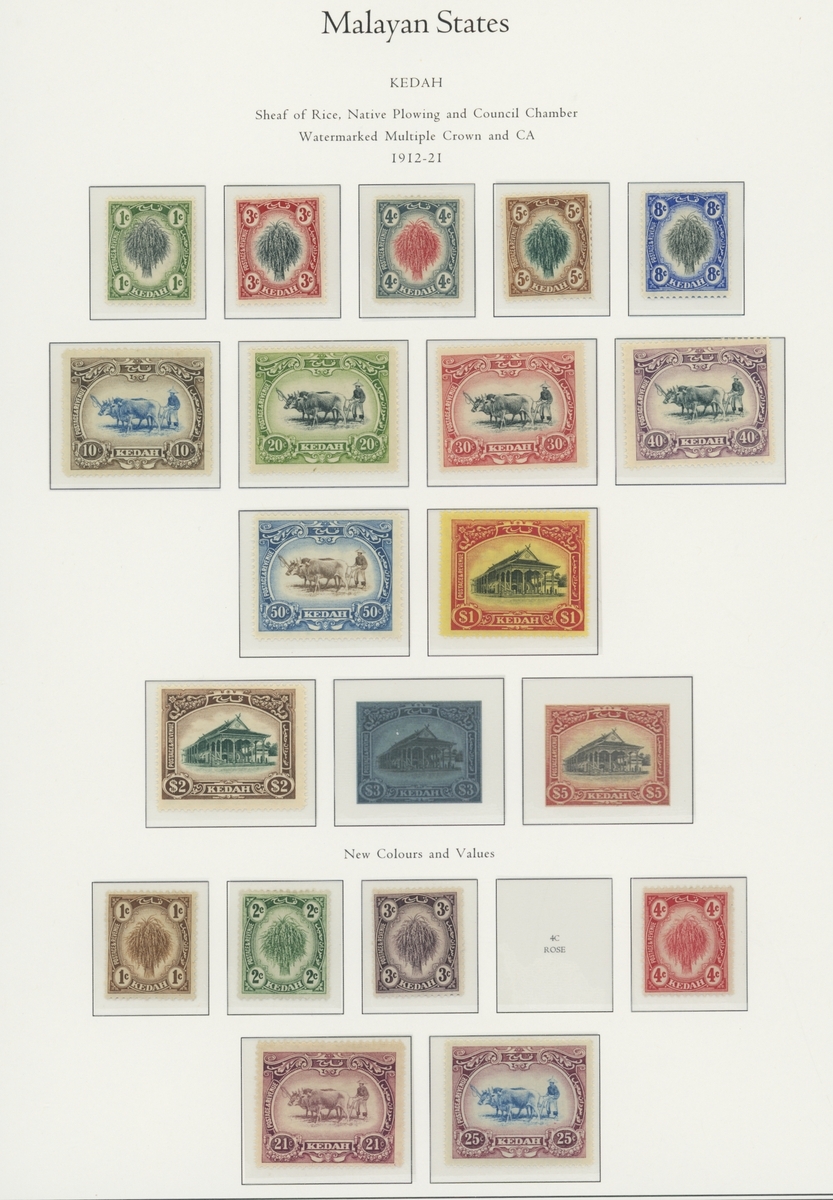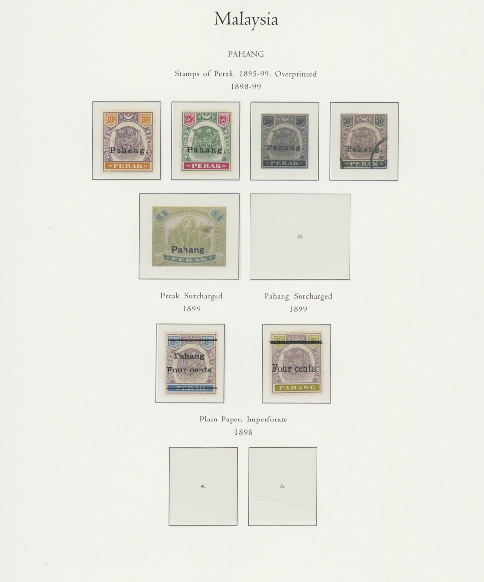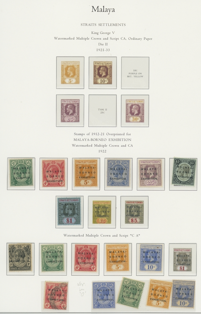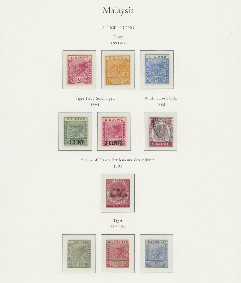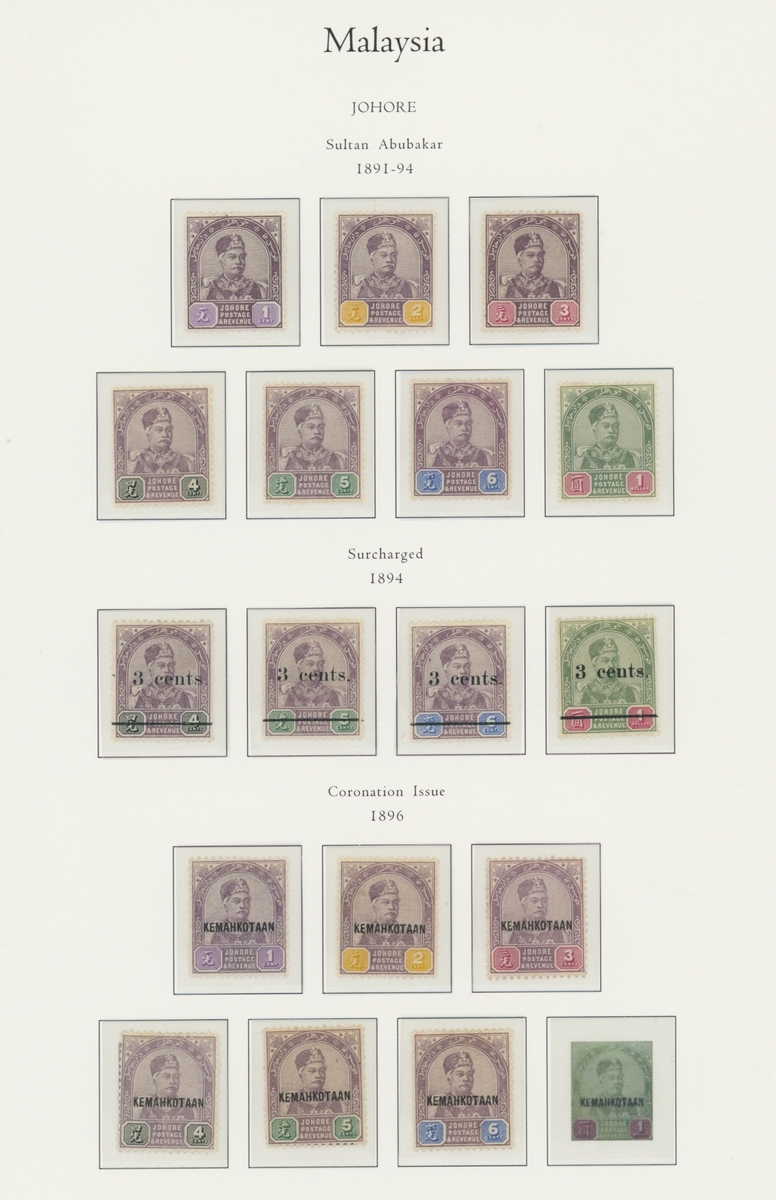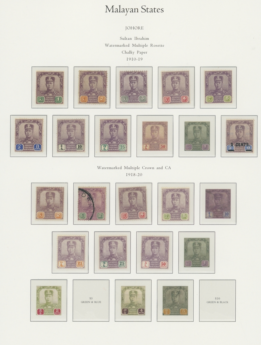 1912-1935 mostly mint collection on album leaves, comprising Straits Settlements, Malayan States and Federated Malay States, including 1912-23 £5 mint and specimen, 1921-33 set to $5, 1936-37 set; Johor 1891-94 set, 1894 surcharges, 1896-99 set, 1922-40 values to $5, 1912-21 set to $2, 1921-32 set less 10c, 1922 Malaya-Borneo Exhibition range; Kelantan 1911-15 set to $5, 1921-28 set; Negri Sembilan 1935-41 set; Pahang 1897 Kuala Lipis 3c. provisional bisected diagonally and tied to small piece, 1935-41 set; Perak range of overprints, 1892-95 set, 1895-99 values to $2, 1935-37 set to $1, plus 1889 officials set to 8c; Selangor 1891-95 set, 1895-99 values to $1, 1935-41 set to $1, plus $2 used; Sungei Ujong 1891-94 set, 1910-19 values to $1, 1921 $5, 1922 Malaya-Borneo Exhibition set to $1, 1921-38 values to $5; 1900 Federated Malay States values to $2, 1922-34 set to $2. A good range, generally good to fine.
