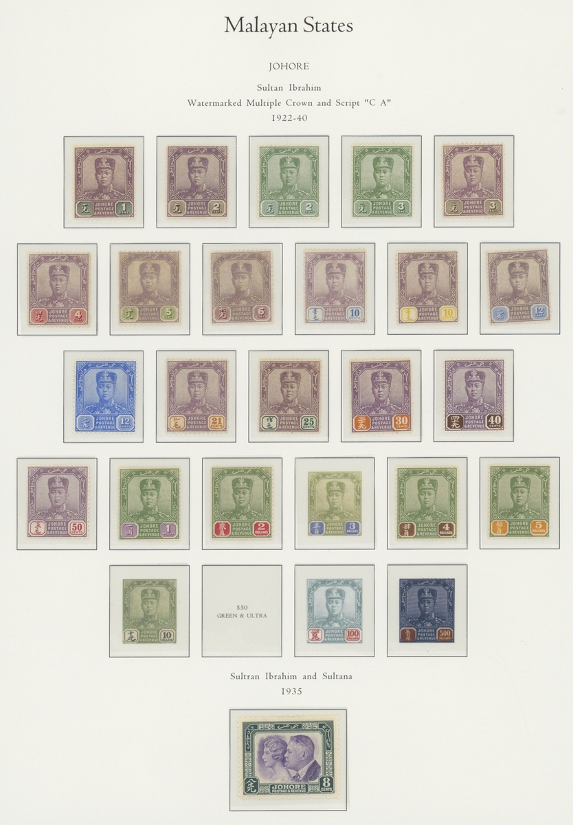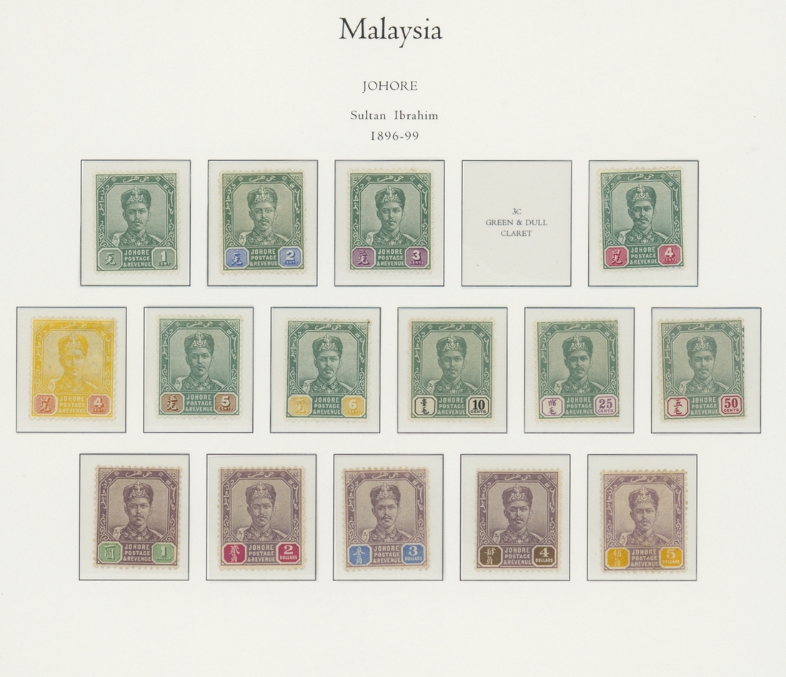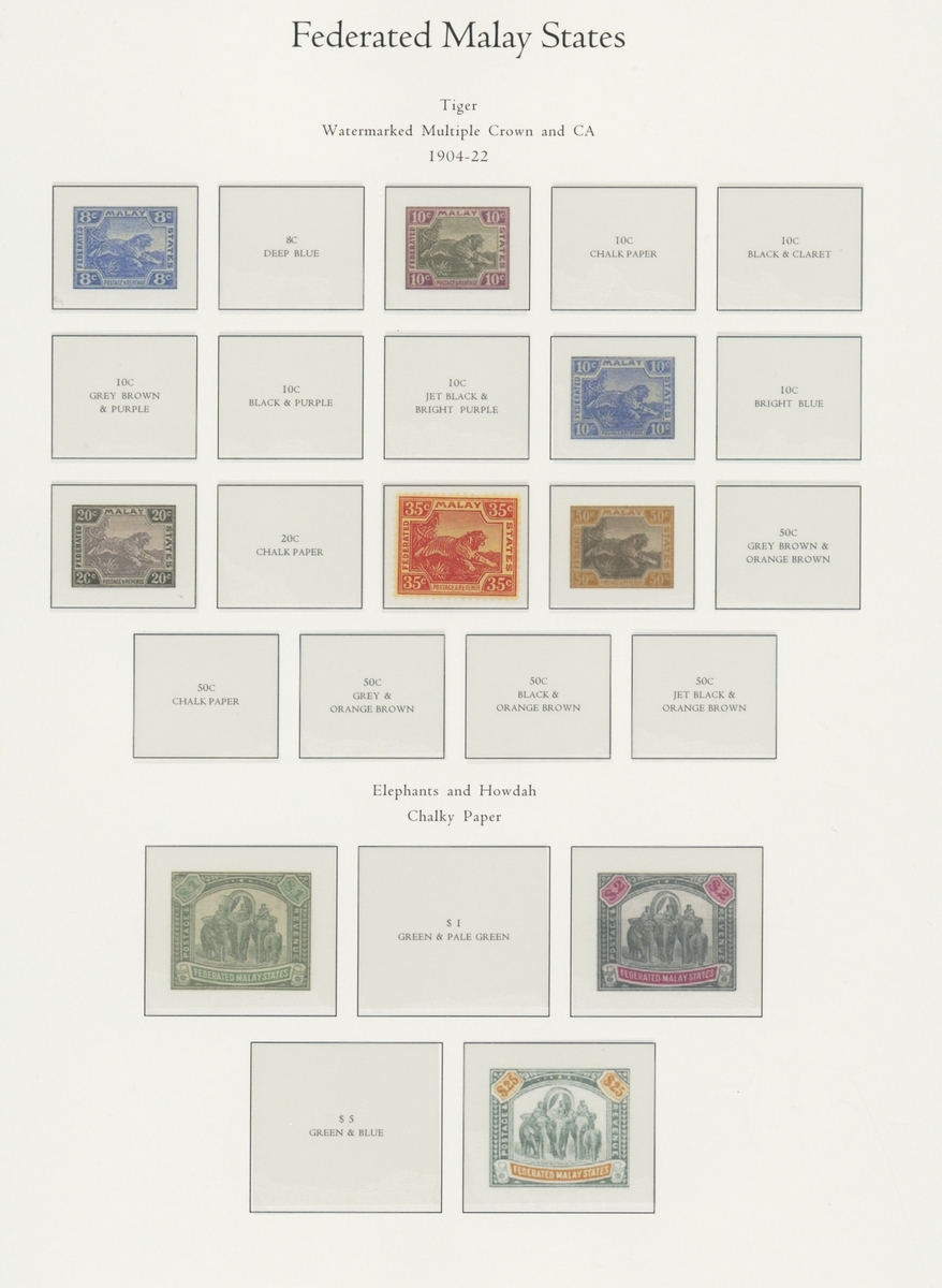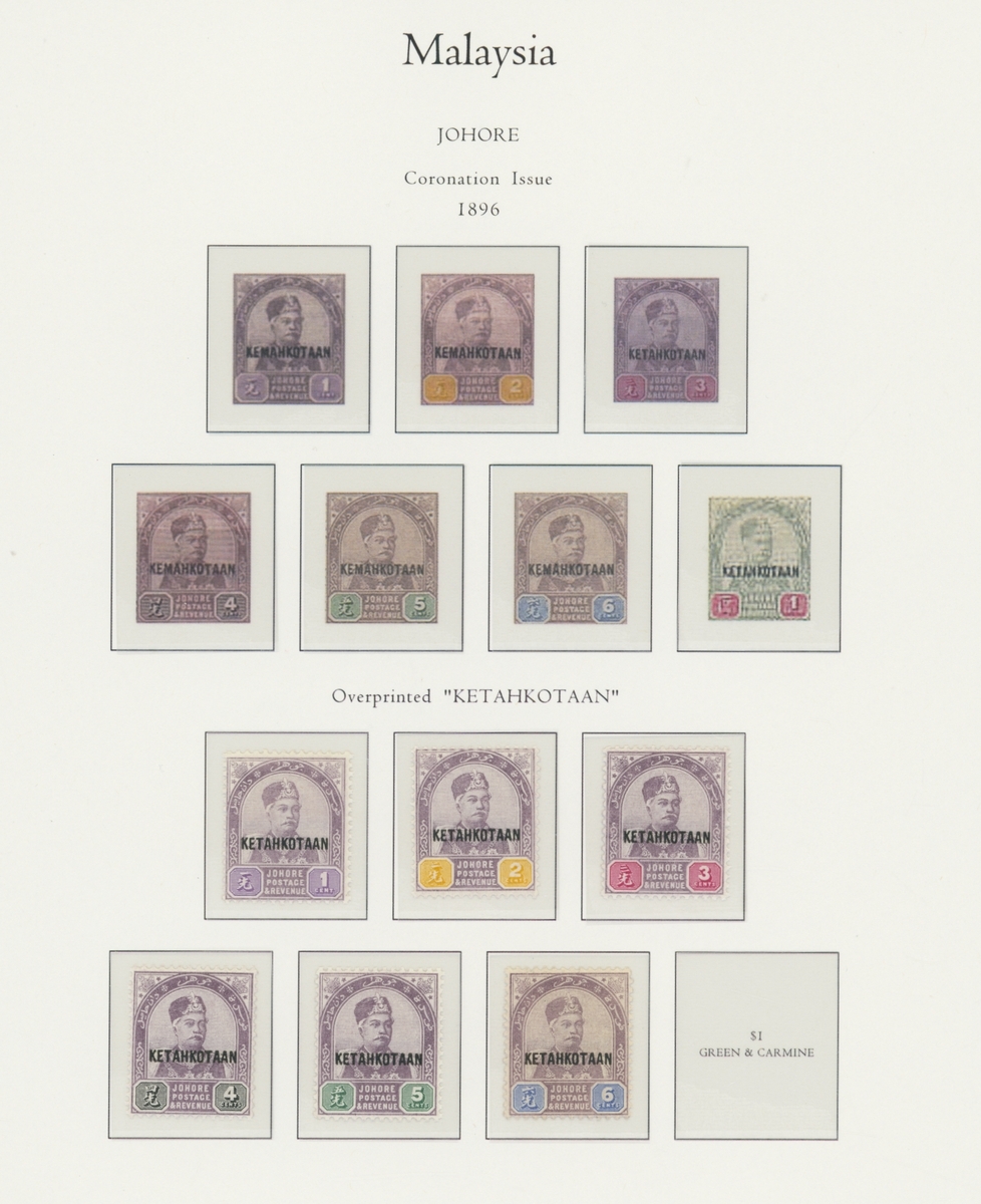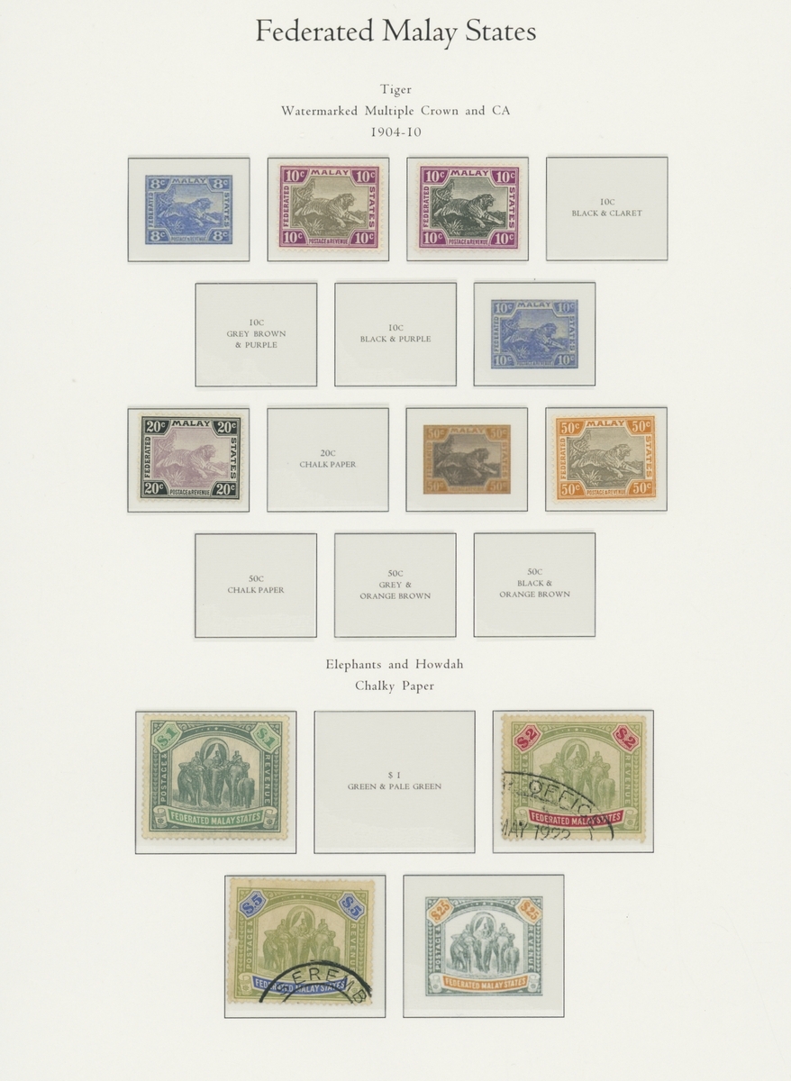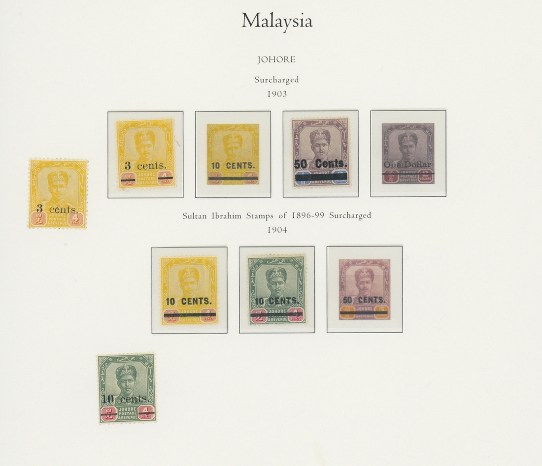 1912-1935 mostly mint collection on album leaves, comprising Straits Settlements, Malayan States and Federated Malay States, including 1912-23 £5 mint and specimen, 1921-33 set to $5, 1936-37 set; Johor 1891-94 set, 1894 surcharges, 1896-99 set, 1922-40 values to $5, 1912-21 set to $2, 1921-32 set less 10c, 1922 Malaya-Borneo Exhibition range; Kelantan 1911-15 set to $5, 1921-28 set; Negri Sembilan 1935-41 set; Pahang 1897 Kuala Lipis 3c. provisional bisected diagonally and tied to small piece, 1935-41 set; Perak range of overprints, 1892-95 set, 1895-99 values to $2, 1935-37 set to $1, plus 1889 officials set to 8c; Selangor 1891-95 set, 1895-99 values to $1, 1935-41 set to $1, plus $2 used; Sungei Ujong 1891-94 set, 1910-19 values to $1, 1921 $5, 1922 Malaya-Borneo Exhibition set to $1, 1921-38 values to $5; 1900 Federated Malay States values to $2, 1922-34 set to $2. A good range, generally good to fine.