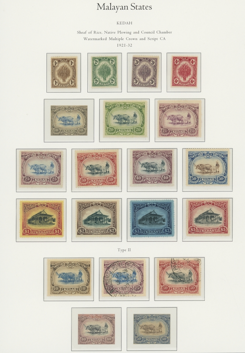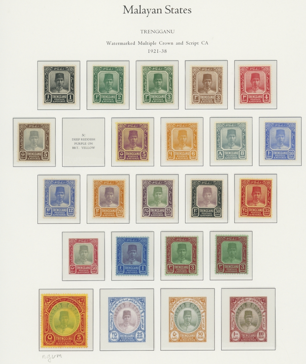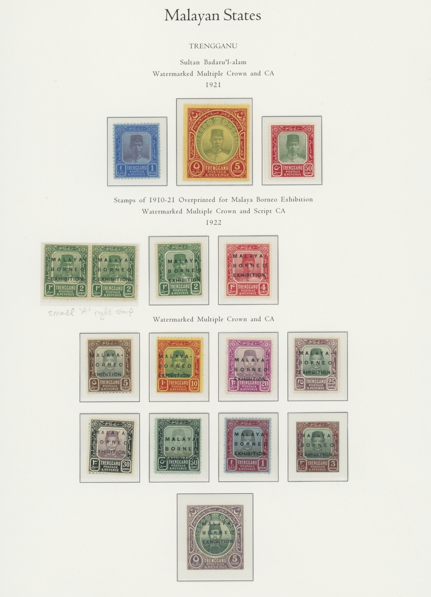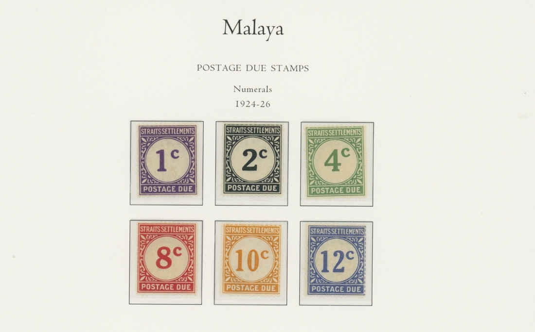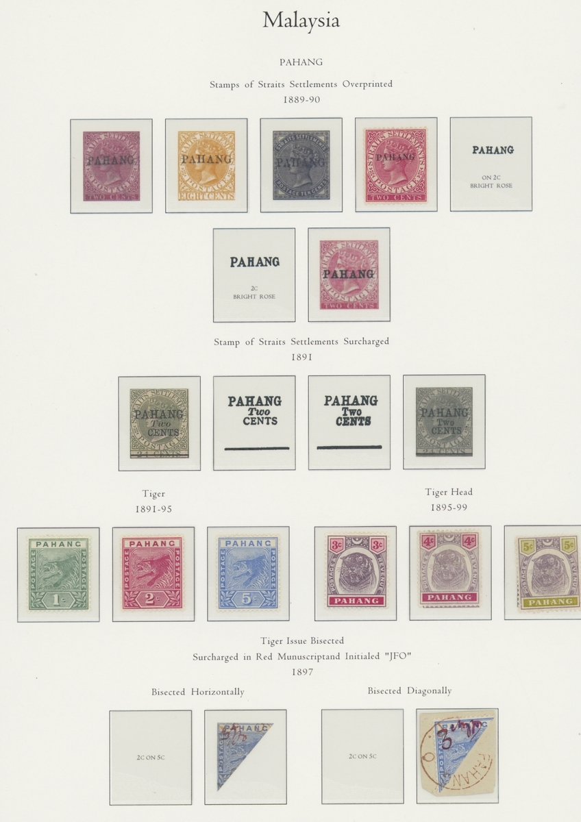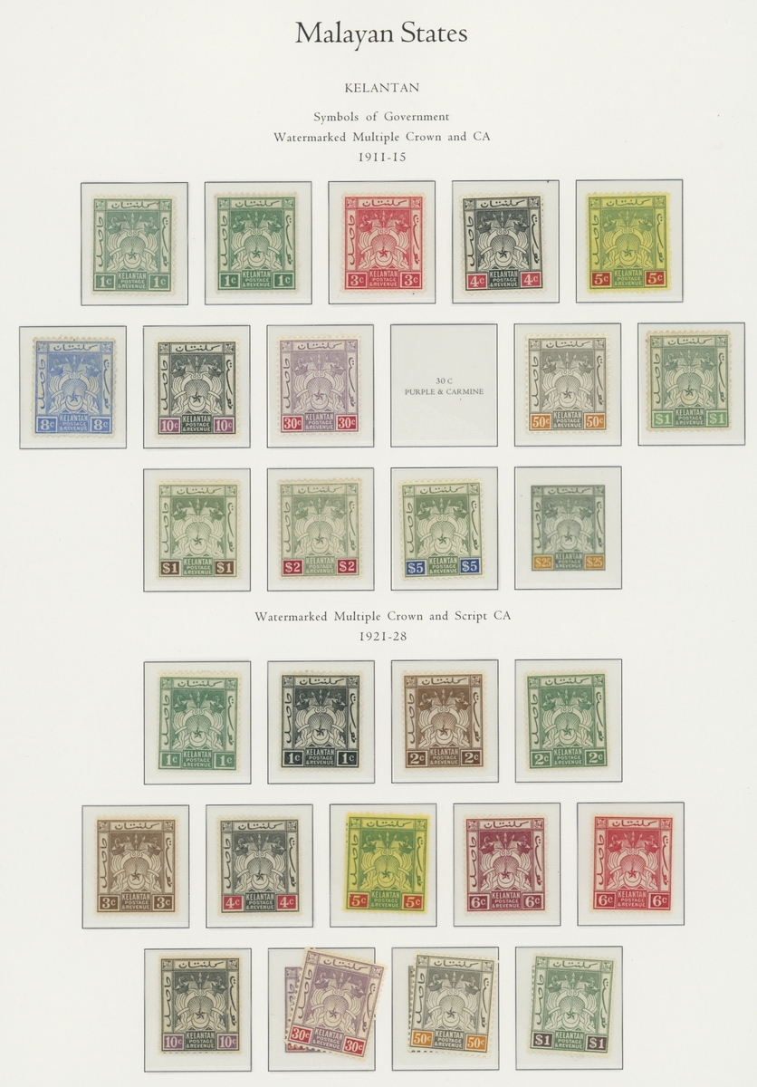 1912-1935 mostly mint collection on album leaves, comprising Straits Settlements, Malayan States and Federated Malay States, including 1912-23 £5 mint and specimen, 1921-33 set to $5, 1936-37 set; Johor 1891-94 set, 1894 surcharges, 1896-99 set, 1922-40 values to $5, 1912-21 set to $2, 1921-32 set less 10c, 1922 Malaya-Borneo Exhibition range; Kelantan 1911-15 set to $5, 1921-28 set; Negri Sembilan 1935-41 set; Pahang 1897 Kuala Lipis 3c. provisional bisected diagonally and tied to small piece, 1935-41 set; Perak range of overprints, 1892-95 set, 1895-99 values to $2, 1935-37 set to $1, plus 1889 officials set to 8c; Selangor 1891-95 set, 1895-99 values to $1, 1935-41 set to $1, plus $2 used; Sungei Ujong 1891-94 set, 1910-19 values to $1, 1921 $5, 1922 Malaya-Borneo Exhibition set to $1, 1921-38 values to $5; 1900 Federated Malay States values to $2, 1922-34 set to $2. A good range, generally good to fine.