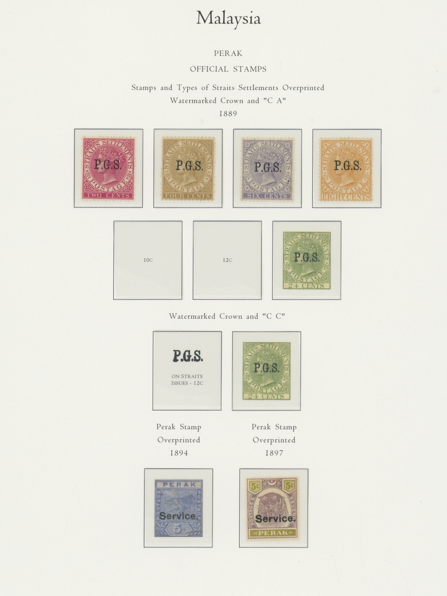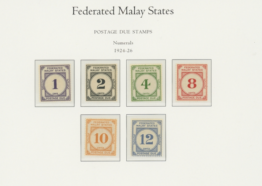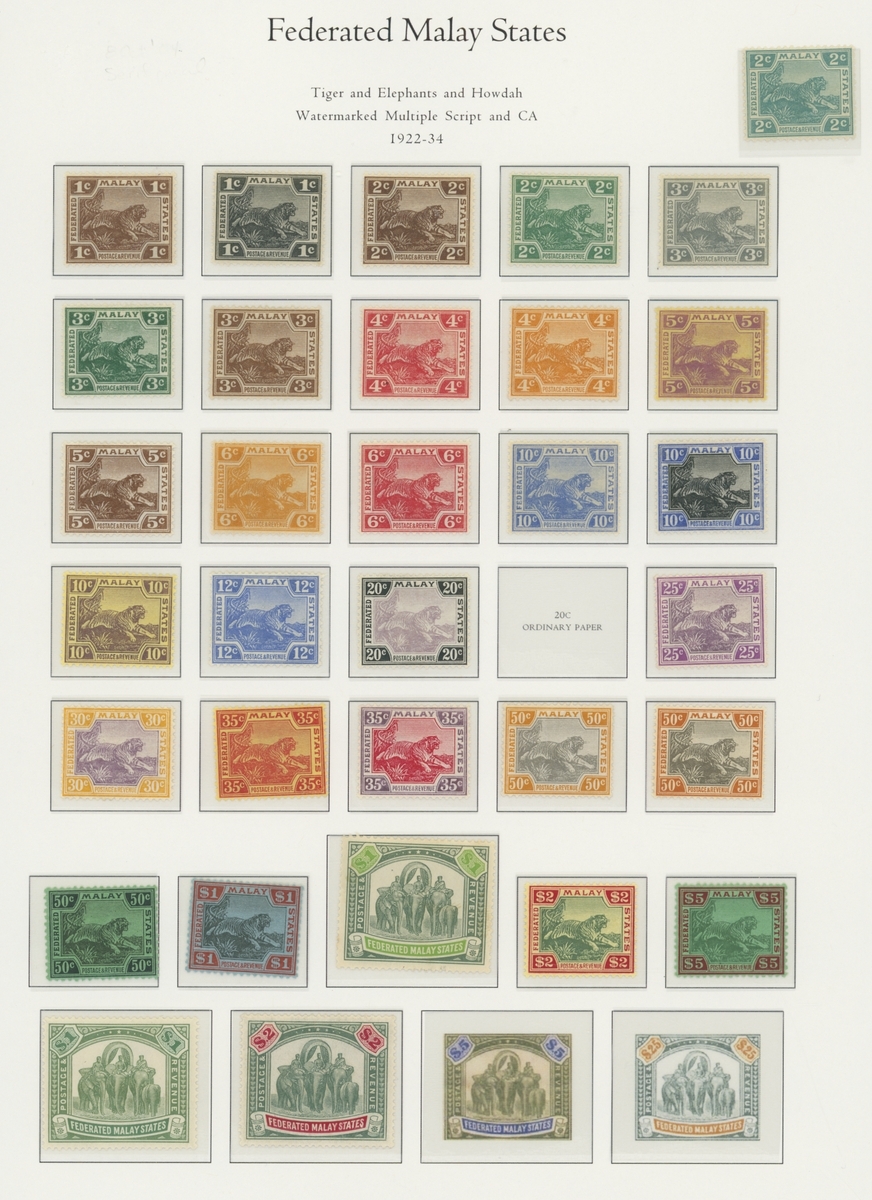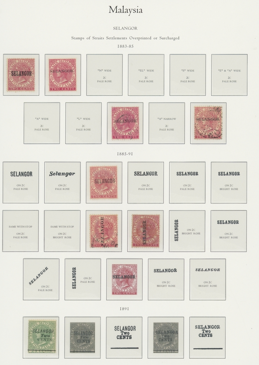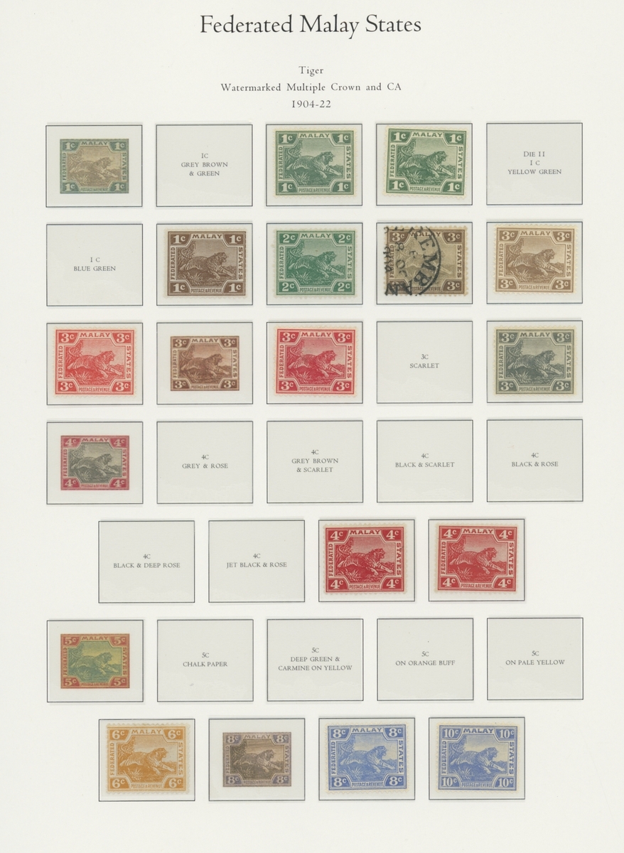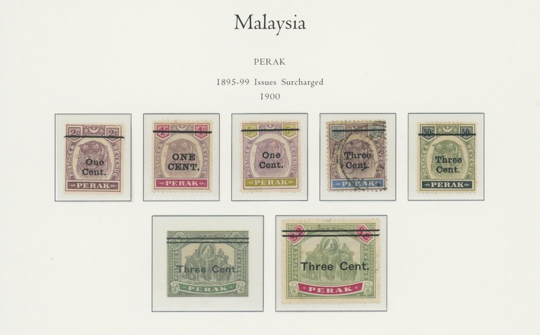 1912-1935 mostly mint collection on album leaves, comprising Straits Settlements, Malayan States and Federated Malay States, including 1912-23 £5 mint and specimen, 1921-33 set to $5, 1936-37 set; Johor 1891-94 set, 1894 surcharges, 1896-99 set, 1922-40 values to $5, 1912-21 set to $2, 1921-32 set less 10c, 1922 Malaya-Borneo Exhibition range; Kelantan 1911-15 set to $5, 1921-28 set; Negri Sembilan 1935-41 set; Pahang 1897 Kuala Lipis 3c. provisional bisected diagonally and tied to small piece, 1935-41 set; Perak range of overprints, 1892-95 set, 1895-99 values to $2, 1935-37 set to $1, plus 1889 officials set to 8c; Selangor 1891-95 set, 1895-99 values to $1, 1935-41 set to $1, plus $2 used; Sungei Ujong 1891-94 set, 1910-19 values to $1, 1921 $5, 1922 Malaya-Borneo Exhibition set to $1, 1921-38 values to $5; 1900 Federated Malay States values to $2, 1922-34 set to $2. A good range, generally good to fine.