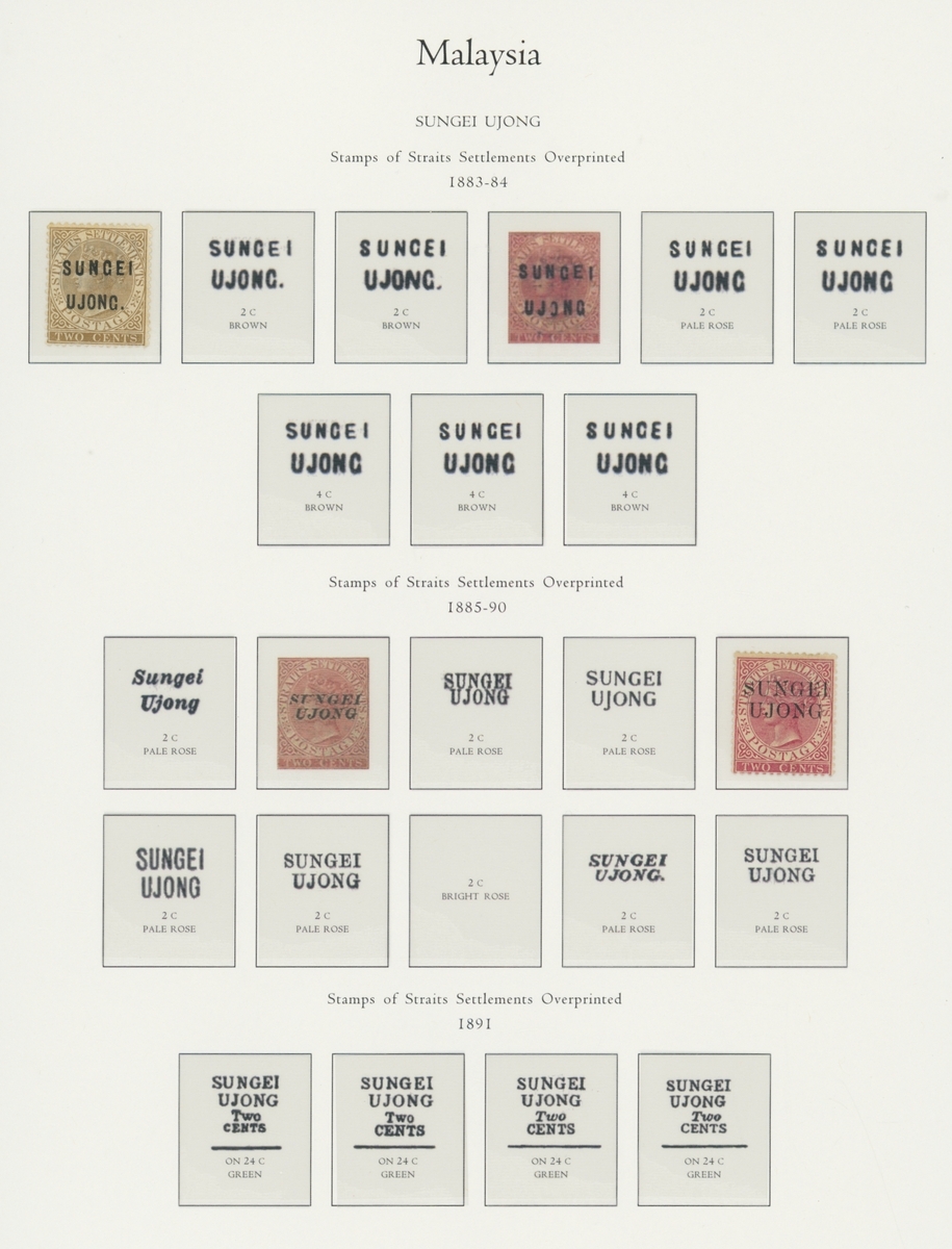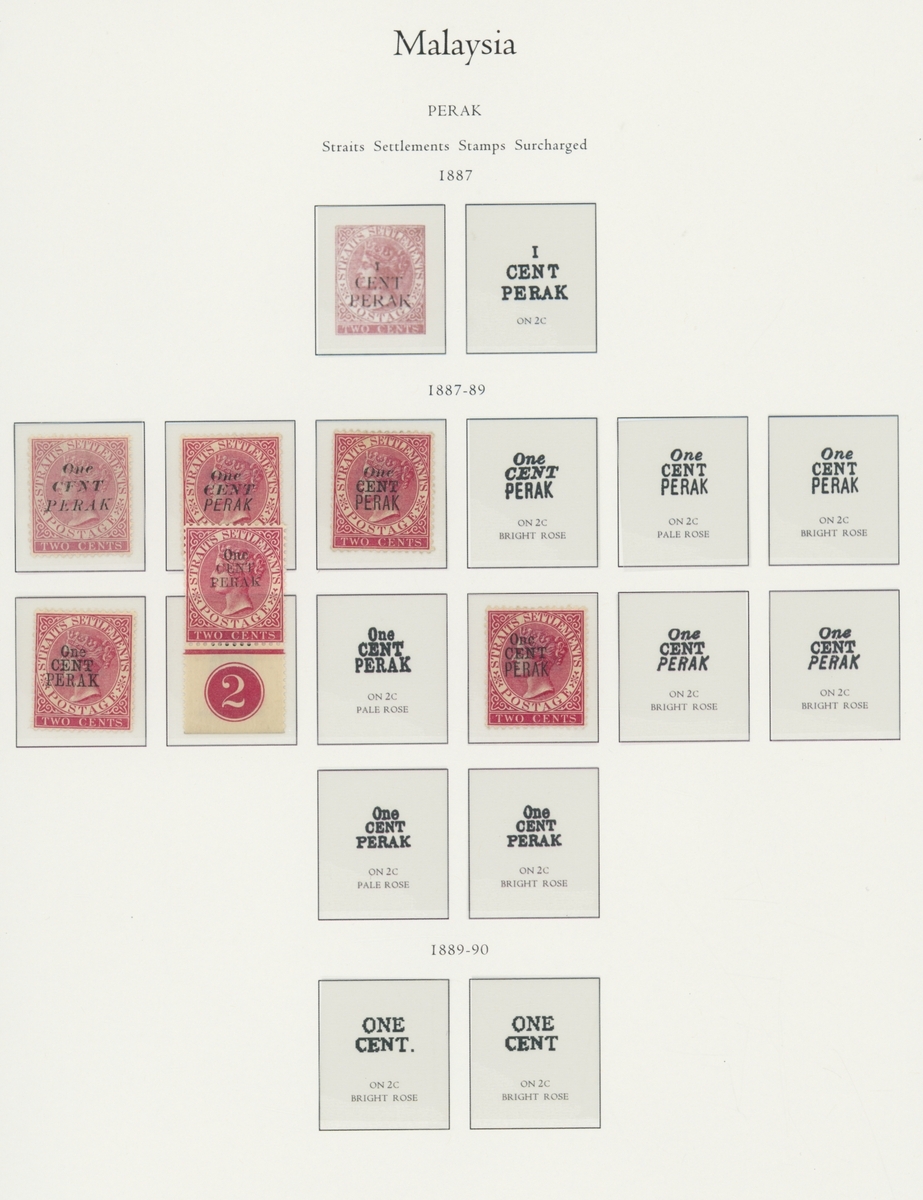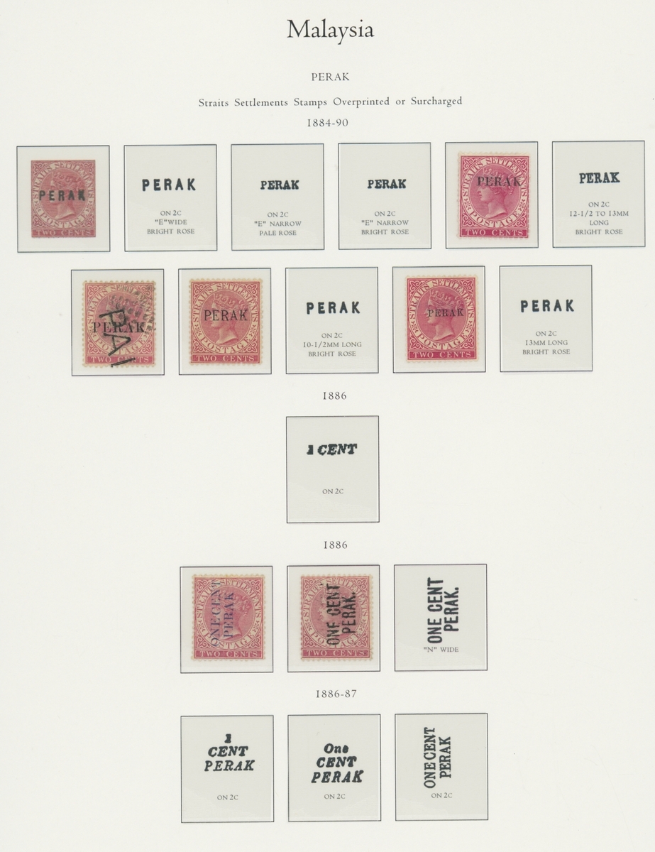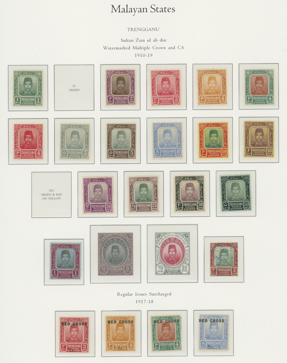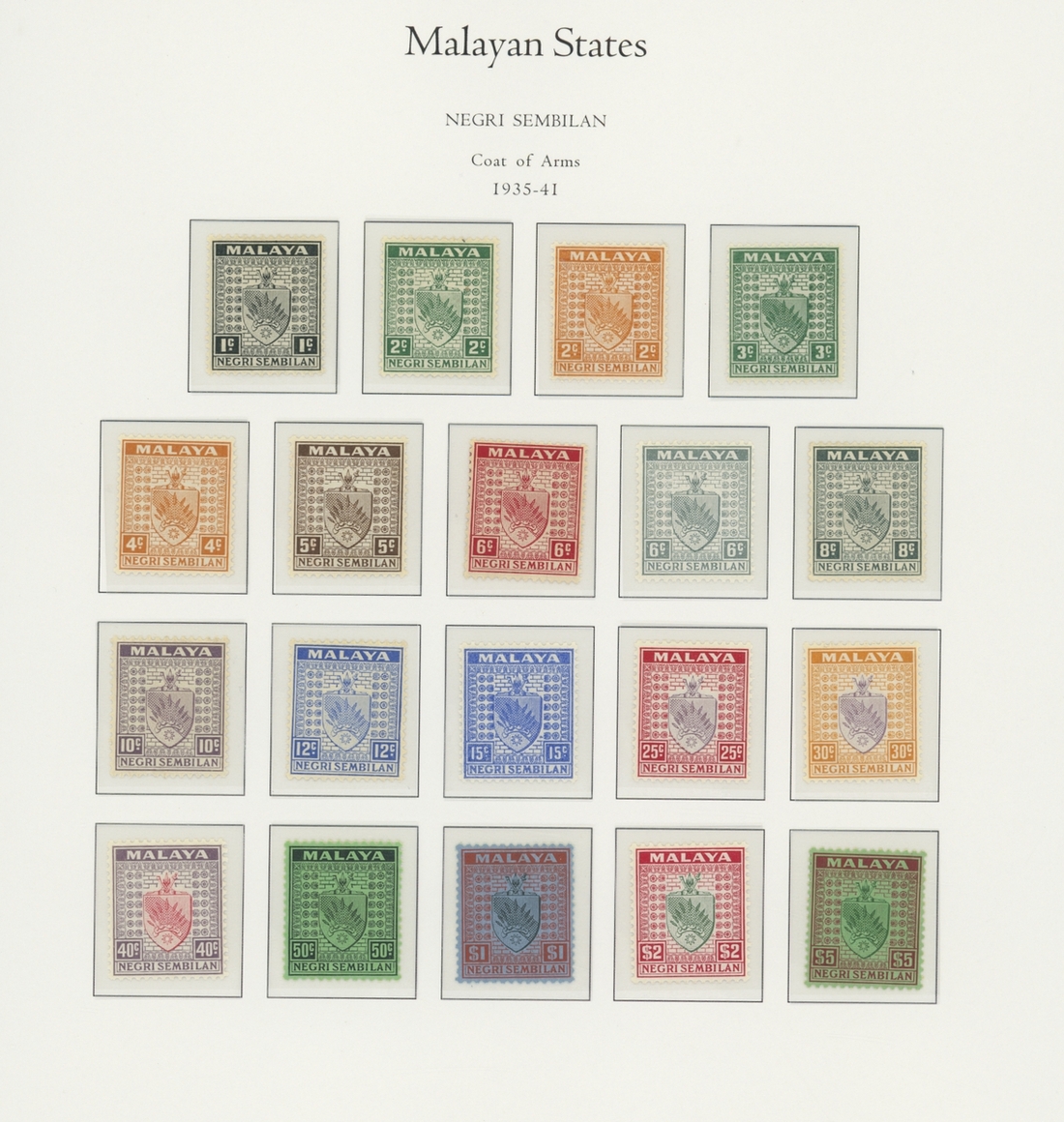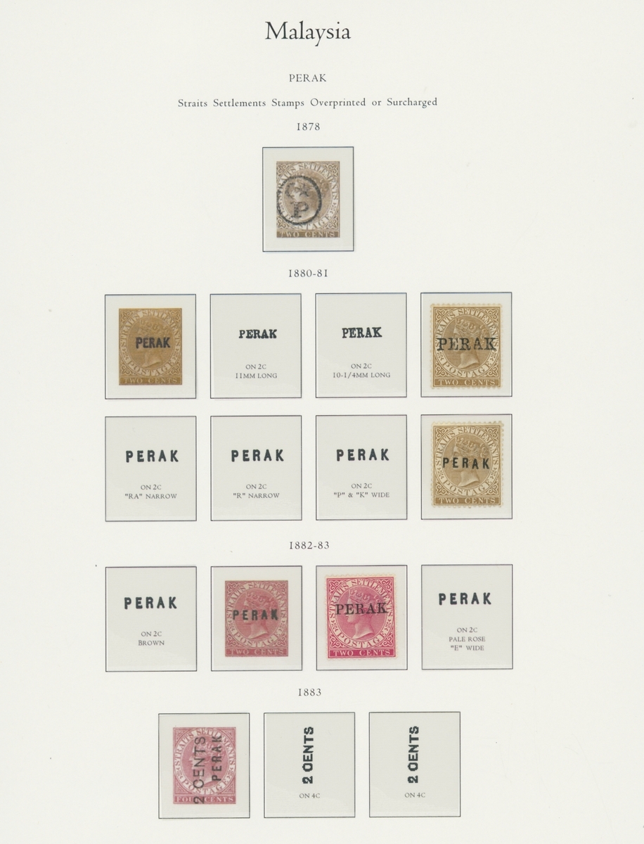 1912-1935 mostly mint collection on album leaves, comprising Straits Settlements, Malayan States and Federated Malay States, including 1912-23 £5 mint and specimen, 1921-33 set to $5, 1936-37 set; Johor 1891-94 set, 1894 surcharges, 1896-99 set, 1922-40 values to $5, 1912-21 set to $2, 1921-32 set less 10c, 1922 Malaya-Borneo Exhibition range; Kelantan 1911-15 set to $5, 1921-28 set; Negri Sembilan 1935-41 set; Pahang 1897 Kuala Lipis 3c. provisional bisected diagonally and tied to small piece, 1935-41 set; Perak range of overprints, 1892-95 set, 1895-99 values to $2, 1935-37 set to $1, plus 1889 officials set to 8c; Selangor 1891-95 set, 1895-99 values to $1, 1935-41 set to $1, plus $2 used; Sungei Ujong 1891-94 set, 1910-19 values to $1, 1921 $5, 1922 Malaya-Borneo Exhibition set to $1, 1921-38 values to $5; 1900 Federated Malay States values to $2, 1922-34 set to $2. A good range, generally good to fine.