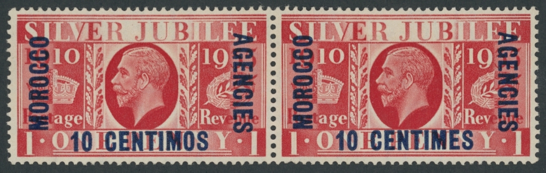 1935 Silver Jubilee 10c. on 1d. scarlet, unused horizontal pair, variety, the right surcharged "10 centimes" instead of centimos, large part original gum, B.P.A. Certificate (1973), S.G. 150a, £1,700. Photo.