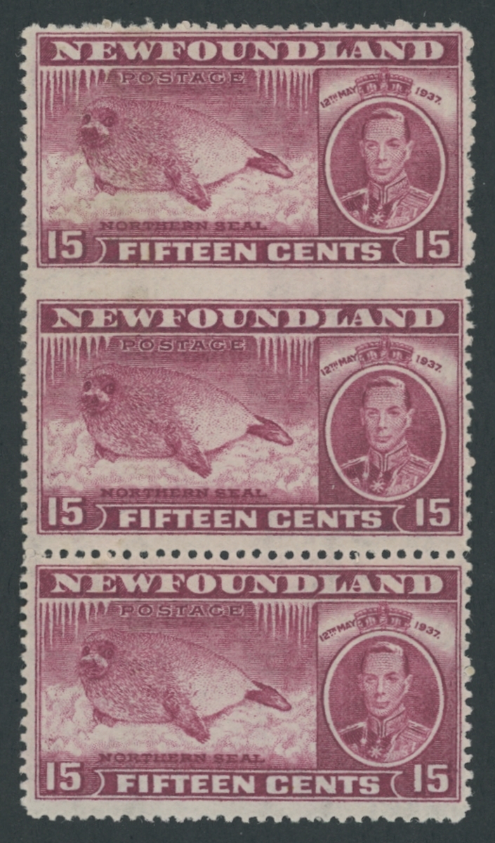 15c. claret vertical strip of three, top two showing variety "imperforate between", large part original gum, very fine, S.G. 264eb, £2,250. Photo.