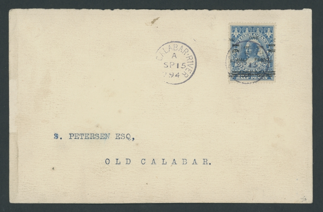 1894 (15 Sept.) envelope front to Old Calabar bearing 1894 ½d. on 2½d. blue, variety surcharge double, tied to front by