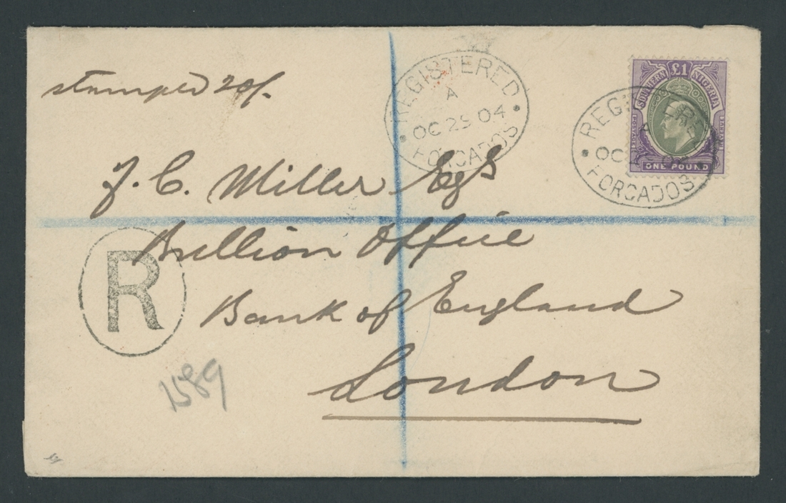 1903-04 CA £1 green and violet, used and tied to envelope registered to London by