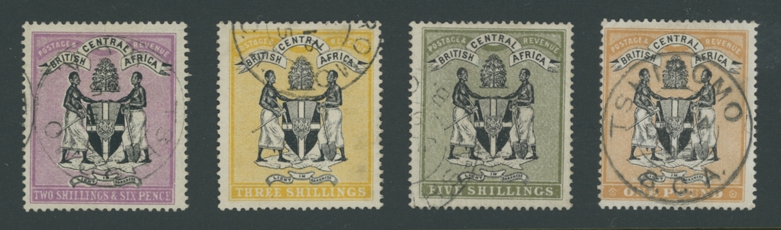 1895 2/6d., 3/-, 5/- and £1, all lightly cancelled to order by Tshiromo double ring d.s., 5/- with small perf. thin and 3/- with bend at foot otherwise an attractive and scarce group. S.G. 26-29, £1,415