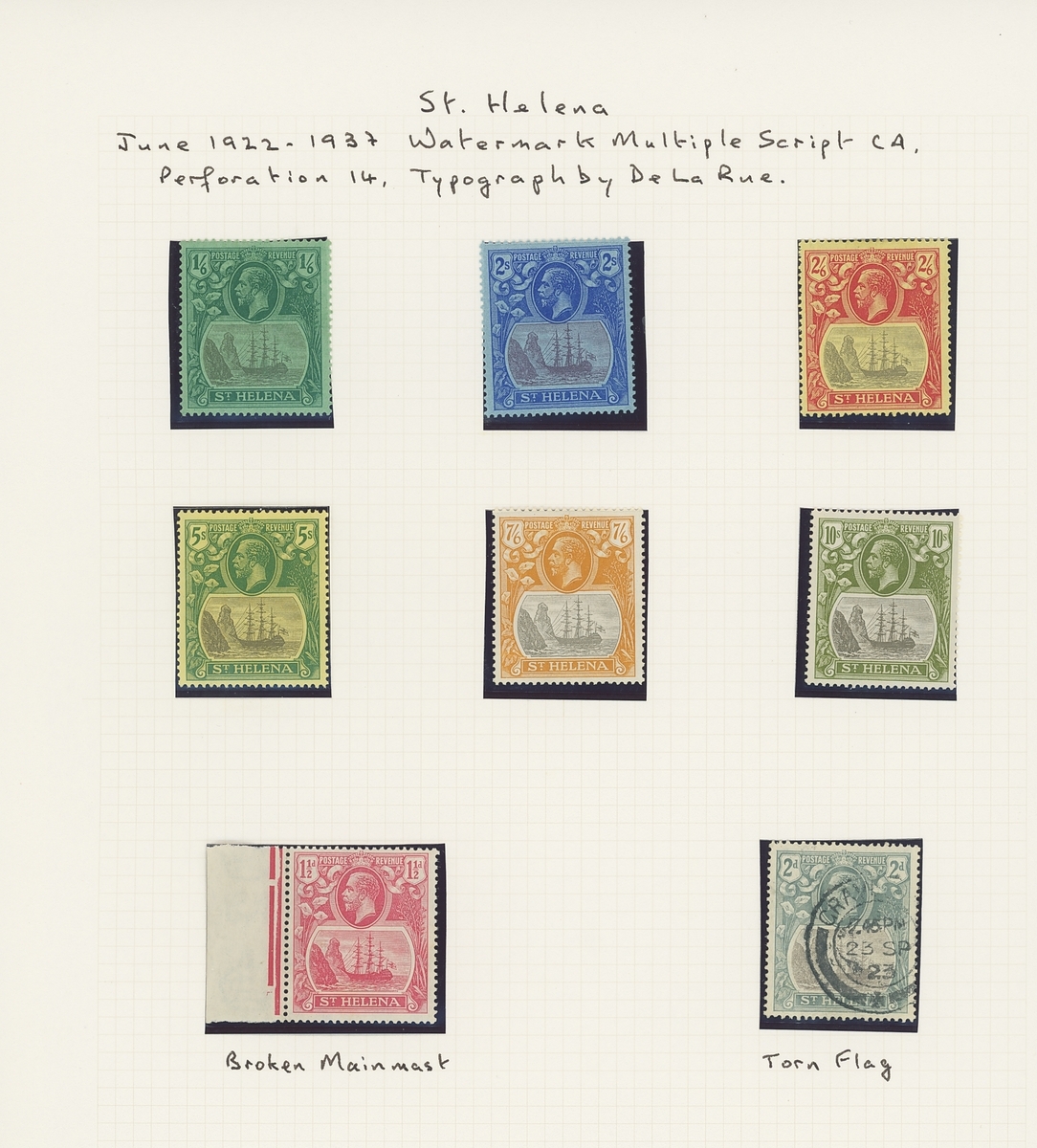 1922-37 set mint (including two each of ½d., 1½d. and 5d.) and 1½d. marginal from the left of the sheet, variety "broken mainmast". The mint with large part original gum, a fine group. S.G.97-112, 99a, £900+