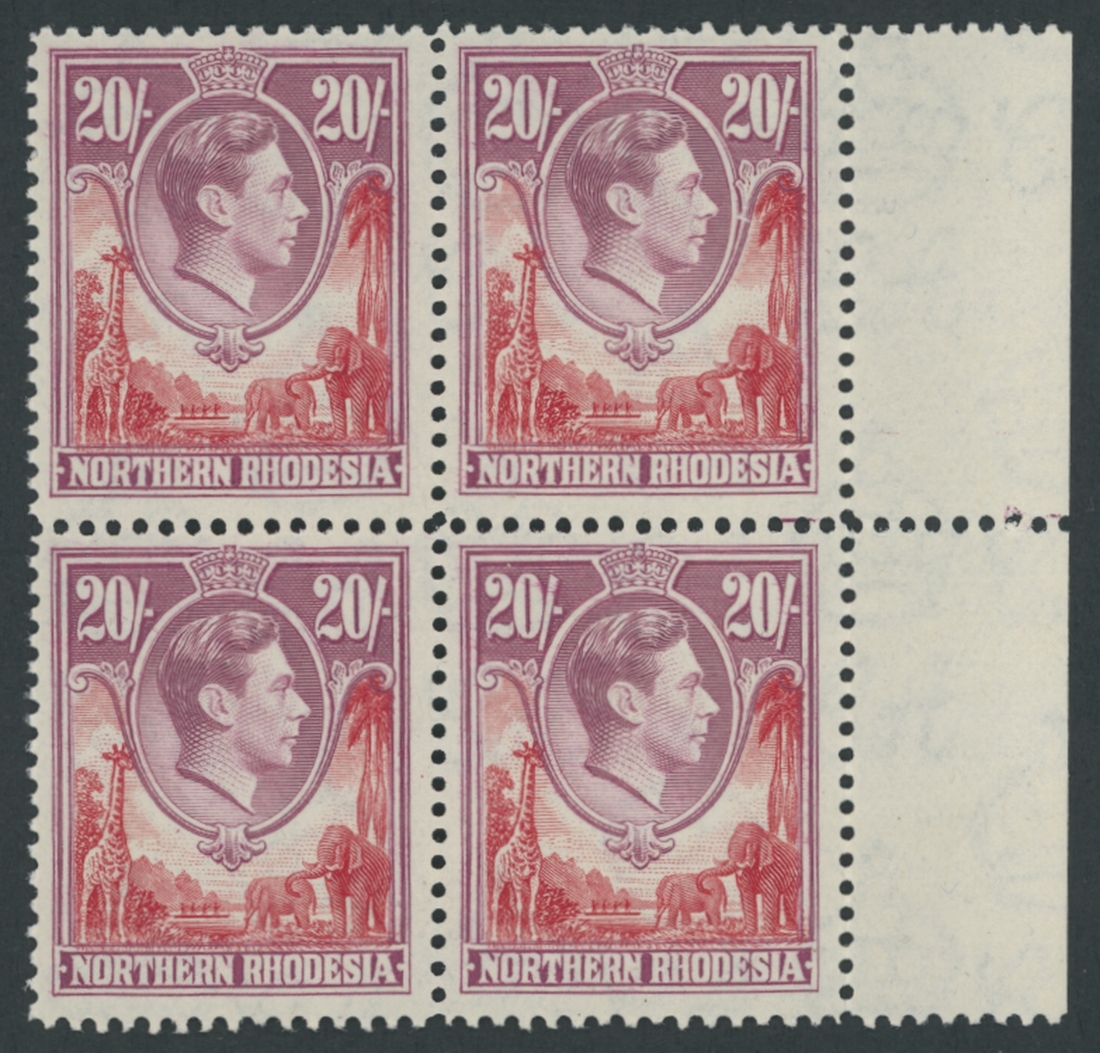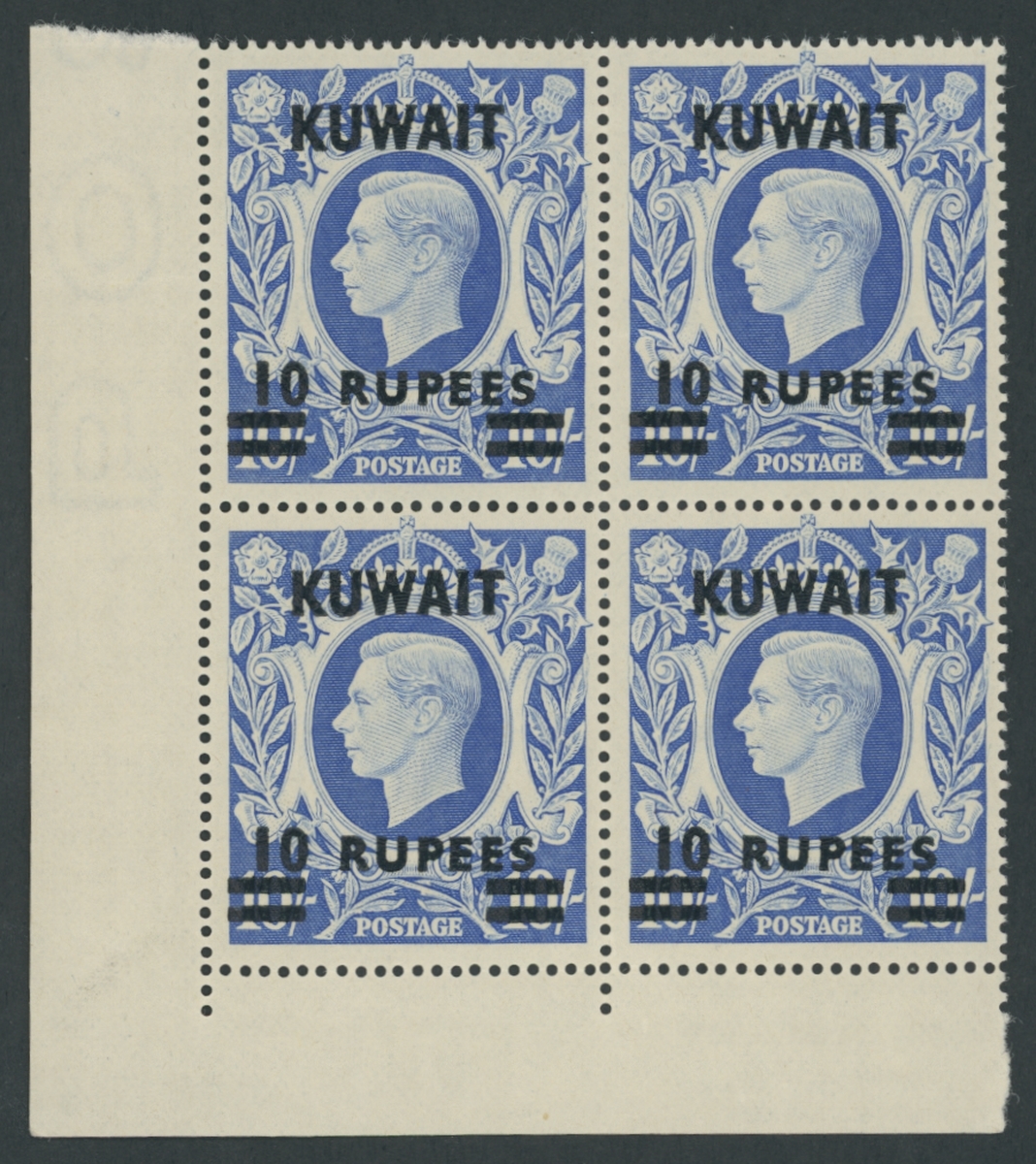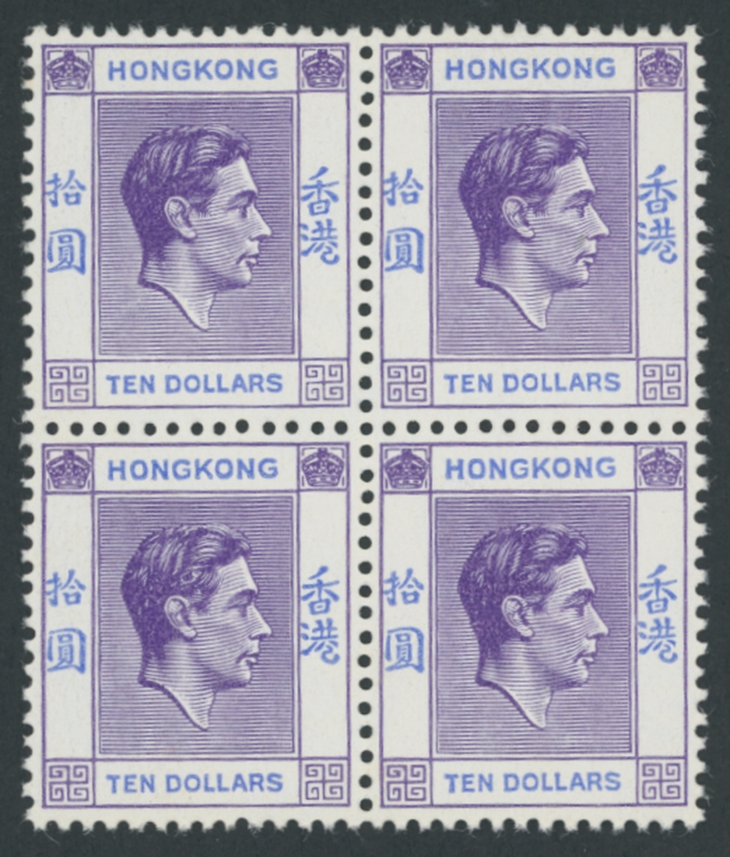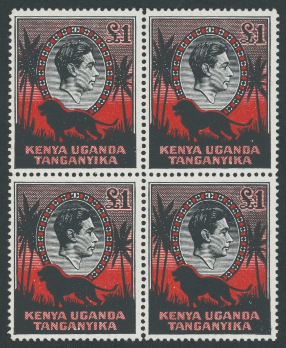 An unusual King George VI British Commonwealth collection in album, comprising mint sets in blocks of four, all seemingly unmounted, including British Honduras 1938-47 set, British Virgin Islands 1938-47 set, Cyprus 1938-51 set, Hong Kong 1938-52 values to $10 lilac and blue, Jamaica 1938-52 set, 1938-54 K.U.T. set (£1 perf. 14), Kuwait 1948-49 set, Leeward Islands 1938-51 set with 10/- plate number "1", Malaya B.M.A. 1945-48 values to $5 purple and orange, Mauritius 1938-49 set, Montserrat 1938-48 set to 5/-, North Borneo 1947 set, 1950-52 values to $10 (less S.G. 366), Northern Rhodesia 1938-52 set, Nyasaland 1945 set, Pakistan 1947 set, Southern Rhodesia 1938 set, St. Helena 1938-44 set, St. Lucia 1938-48 set, St. Vincent 1938-47 set, Seychelles 1938-49 values to 5r., Swaziland 1938-54 set, Transjordan 1930-39 set, Trinidad and Tobago 1938-44 set, Tristan da Cunha 1952 overprinted set, Turks and Caicos 1938-45 set, 1952 imprint set, Zanzibar 1936 set. An excellent lot with plenty of potential, £17,000+ Photo.