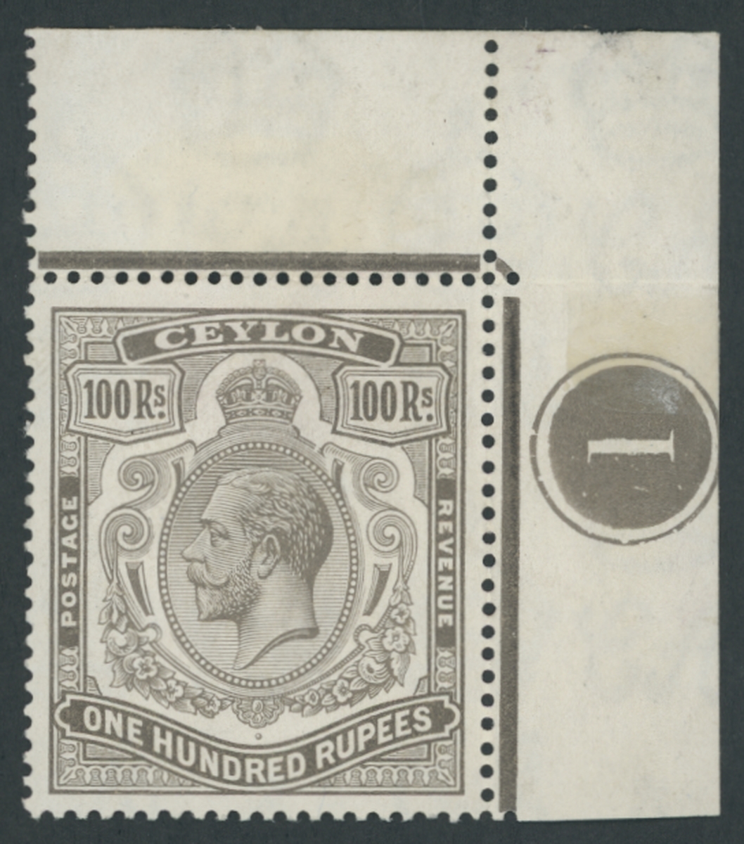 100r. brownish grey, corner marginal from the top-right of the sheet, with plate number "1", fine mint, mounted on the margin only, variety "break in scroll". B.P.A. Certificate (2022), S.G.359a, £6,000.