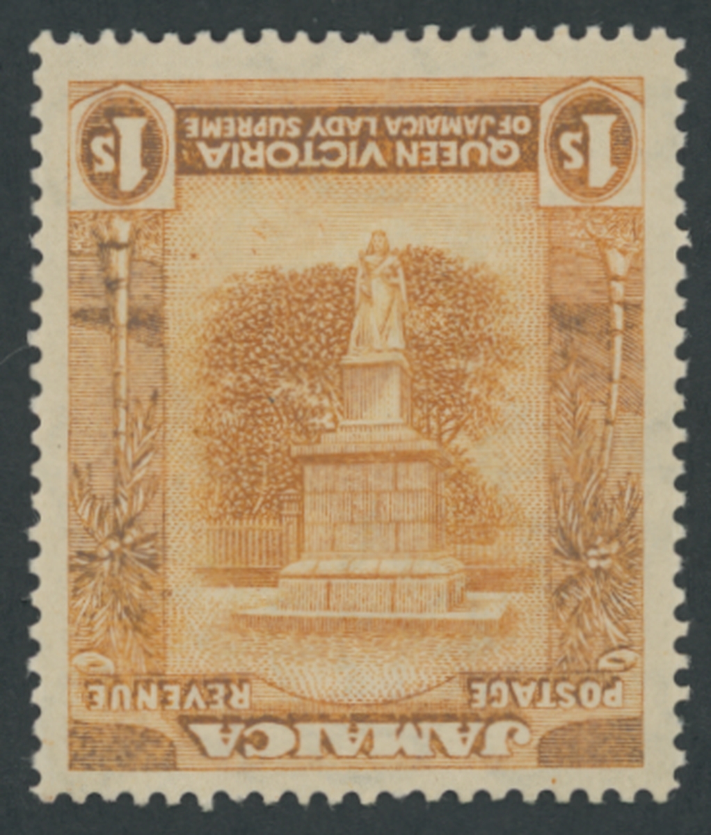 1919-21 1/- orange yellow and red orange, variety "frame inverted", large part original gum, a fine example of this striking rarity of Jamaica, S.G. 85a, £40,000.