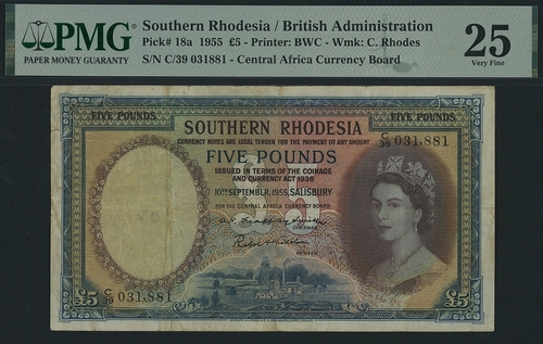 Southern Rhodesia, British Administration, £5, Salisbury, 10th September 1955, serial number C/39 031881, (Pick 18a), in PMG holder 25 Very Fine