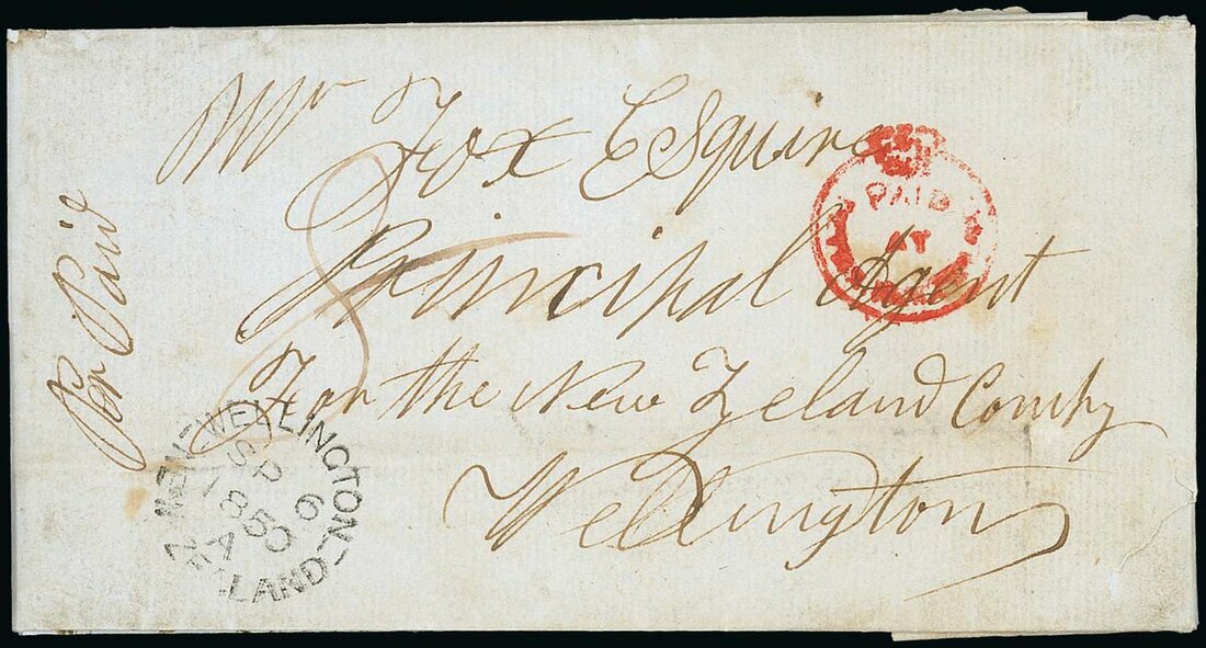 Wanganui to William Fox, Principal Agent of the New Zealand Company in Wellington. On the front is a blurred Crowned circle