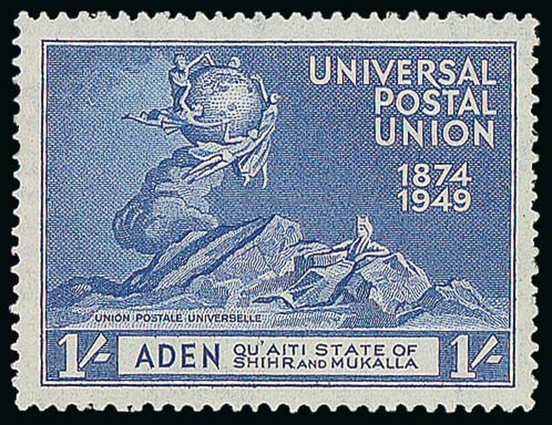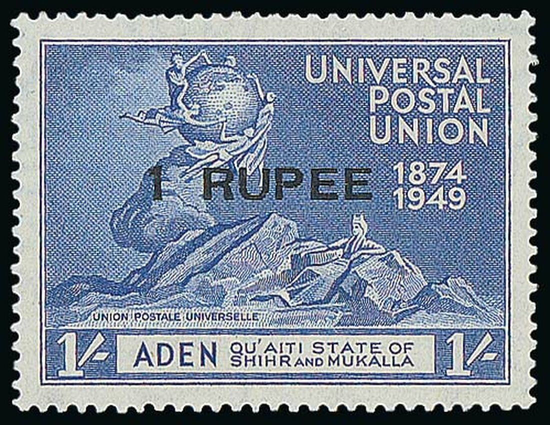 1949 UPU 1r. on 1/- blue, variety surcharge omitted, superb unmounted mint, very rare. Murray Payne Certificate (2008). S.G. 19a, £4,000. Photo