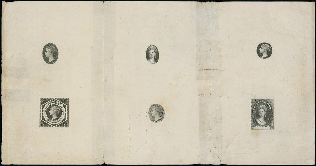 Perkins Bacon piece of wove paper (270x140mm.) showing proof impressions of New South Wales Diadem Queen's head and surround and complete design with blank value tablet, Tasmania Chalon Queen's head and surround and complete design with blank value tablet, plus two other different vignettes of Queen's head; two vertical folds and some other minor faults. Very rare and not previously seen by us in it's entirety. Photo
