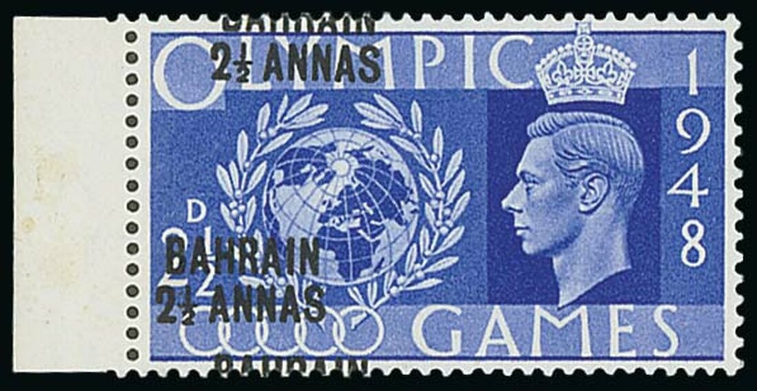 1948 (29 Jul.) 2½a. on 2½d. ultramarine from the left of the sheet, variety surcharge double, superb unmounted mint. Murray Payne Certificate (2003). S.G. 63a, £3,500. Photo