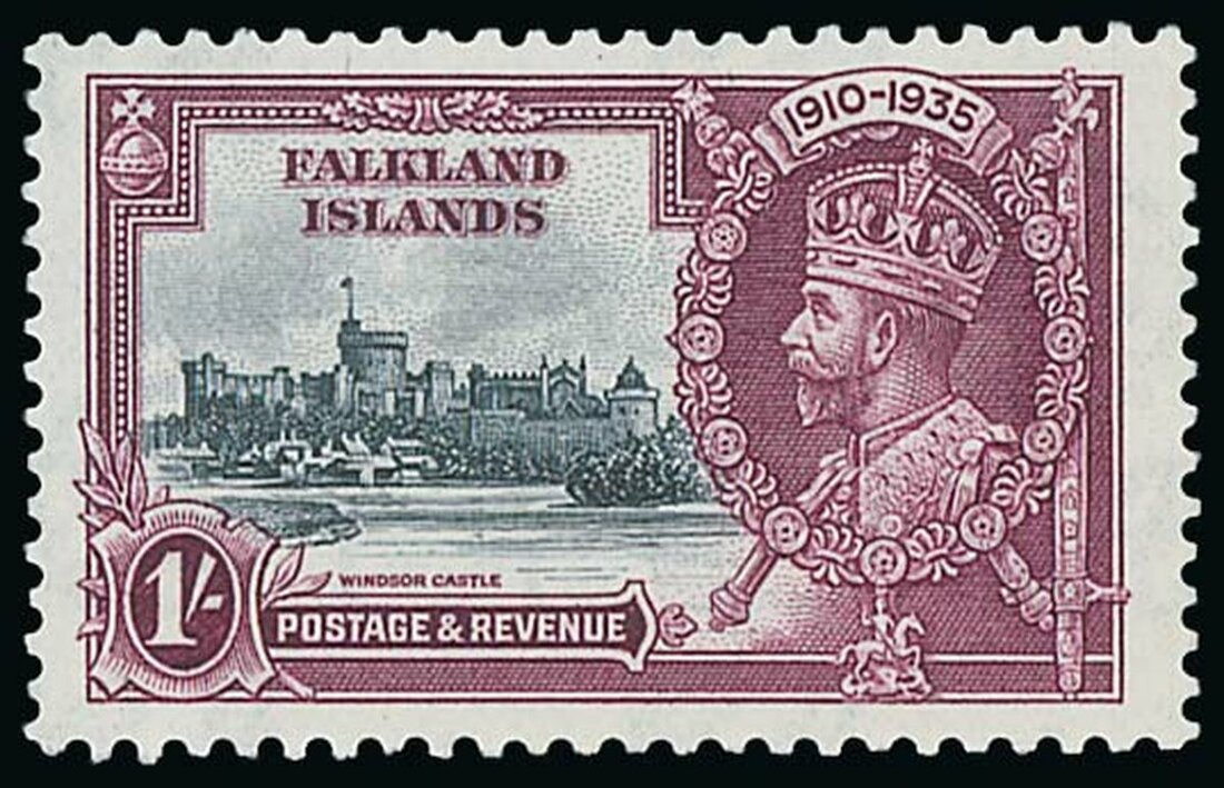 1935 Jubilee 1/- slate and purple, variety double flagstaff, fine mint. S.G. 142e, £1,700. Photo