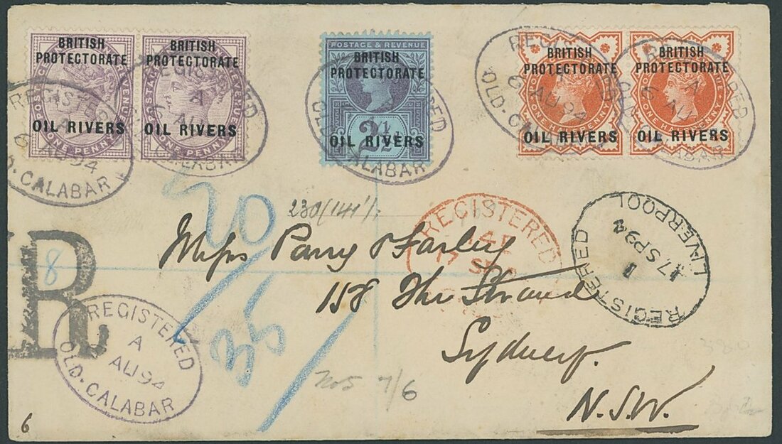1894 (6 Aug.) envelope registered to Sydney, bearing 1892 ½d. pair, 1d. pair and 2½d., all tied by
