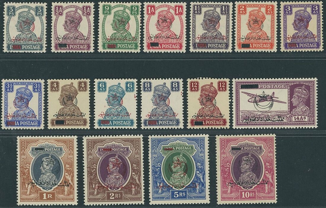 1947 3p. to 10r. set of seventeen with Star and Crescent overprint, very lightly mounted mint. A fine set of these very rare overprints. Murray Payne Certificate (2013). S.G. 1-17, £20,000. Photo