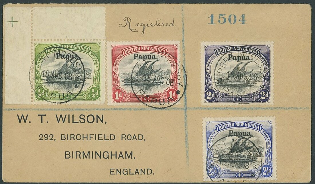 1908 (15 Aug.) Wilson envelope registered to Birmingham, bearing 1906 large "Papua" ½d., 1d., 2d. and 2½d., all tied by