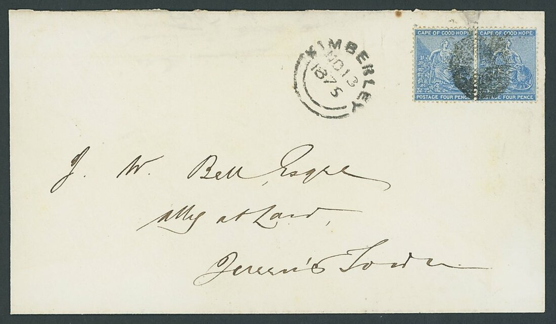 1875 (13 Nov.) double rate envelope to Queen's Town, bearing 4d. pair centrally cancelled by dumb obliterator and showing