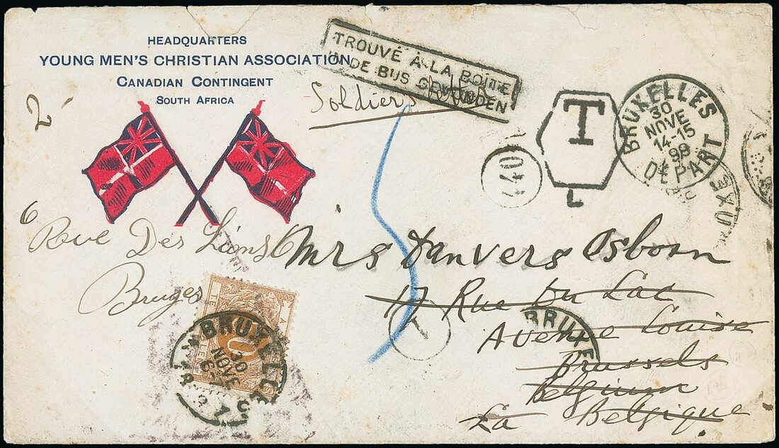 Mail Transfer at Sea: 1899 (15 Nov.) Y.M.C.A. crossed flags envelope (type C) to Belgium marked "Soldier's Letter" and redirected on arrival, bearing Belgian 10c. postage due tied by Bruxelles c.d.s., tax handstamp, boxed "