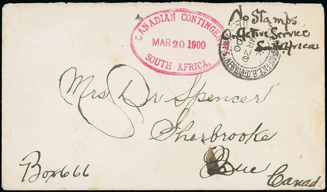 1900 (20 Mar.) stampless envelope from Trooper Frye "D" company at Bloemfontein to Que, marked "No Stamps On Active Service South Africa" bearing a fine strike of the Canadian Contingent dated oval in pink (type II) and Field Post Office B.O. c.d.s., the reverse with faint Sherbrooke arrival c.d.s. (16.4). Fine and an early date for the oval datestamp which was introduced on 13th March. Photo