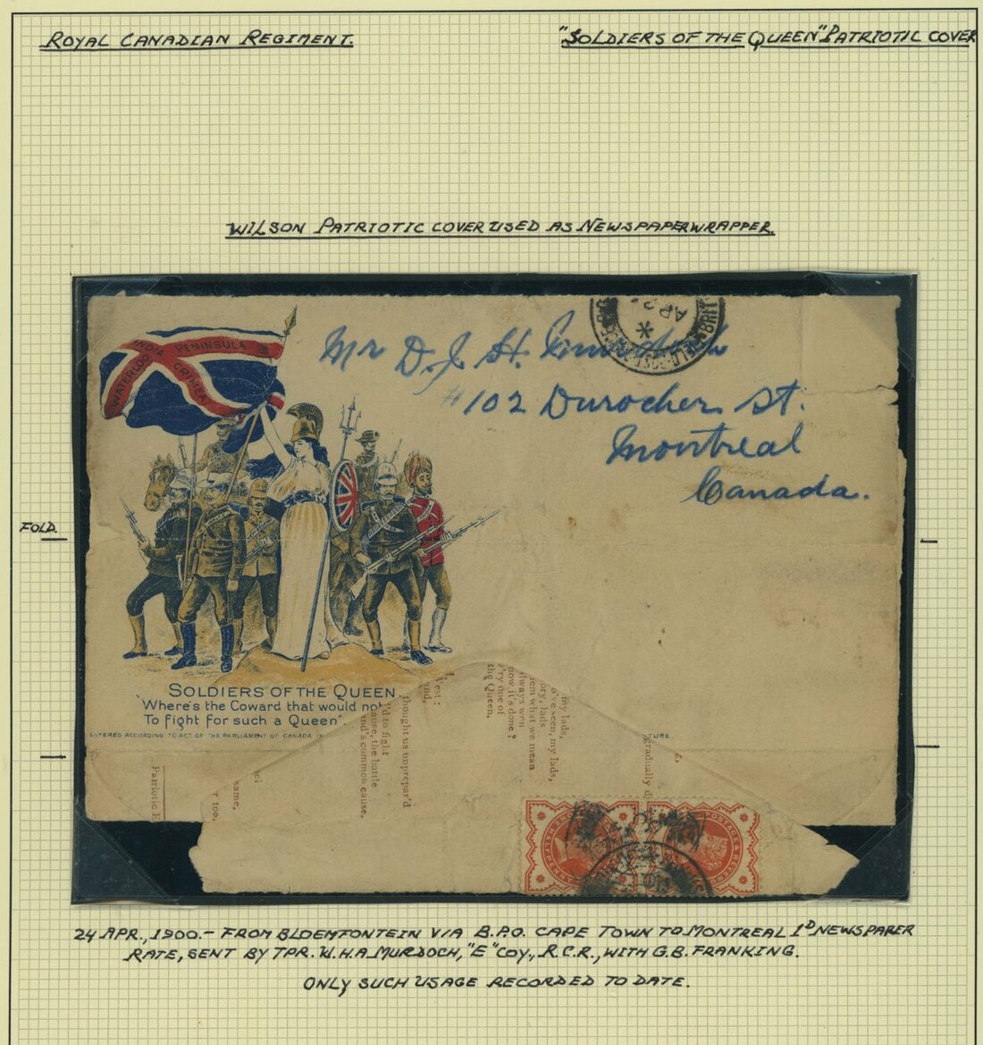 1900 (24 Apr.) Wilson patriotic envelope 'Soldiers of the Queen' (Rowe 50-7) which has been used as a newspaper wrapper addressed to Montreal and bearing G.B. Jubilee ½d. vermilion pair tied by Field Post Office B.O. c.d.s.; horizontal folding creases. Very unusual and thought to be the only such example