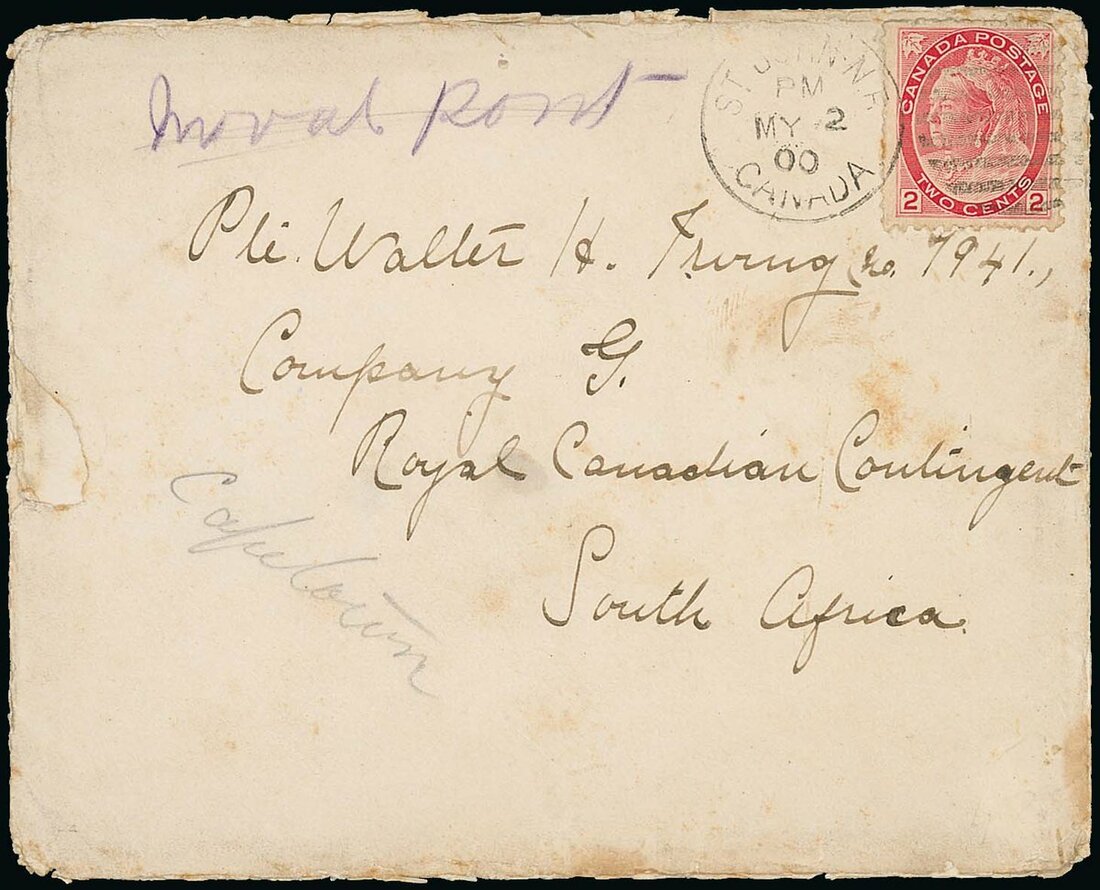 Incoming Mail: 1900 (2 May) envelope to Pte. Irving, Company G bearing Canada 2c. carmine tied by St. John duplex with redirection notes to Norvals Point (deleted) and Cape Town. A very rare surviving example of mail to the Canadian Contingent. Photo