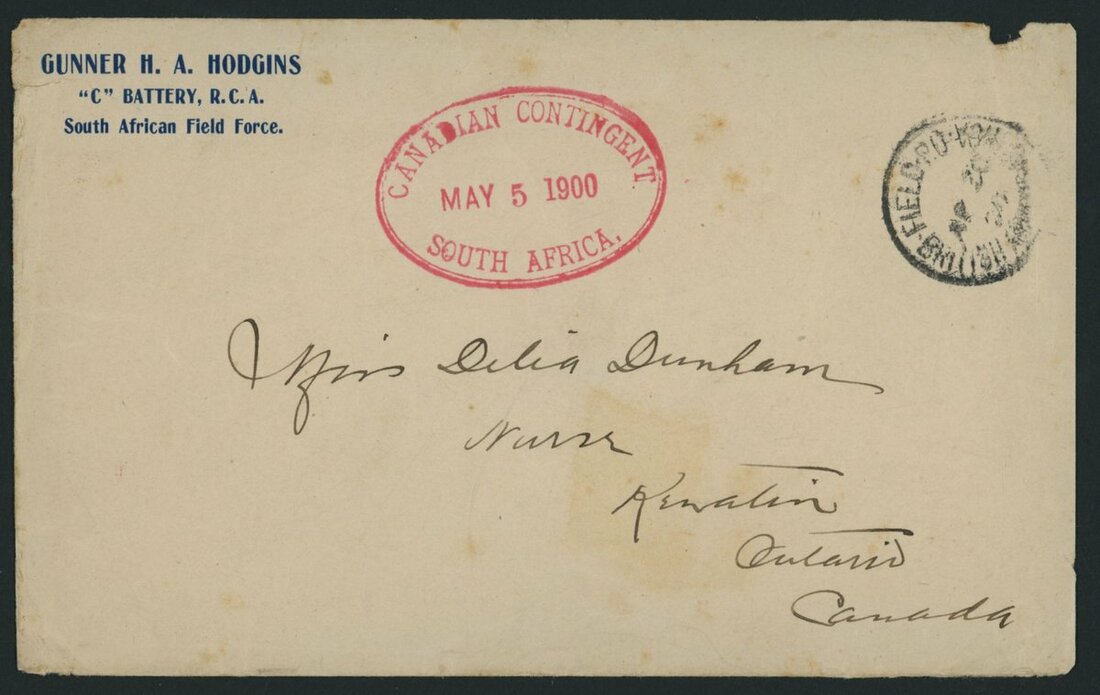 1900 (30 Apr.) stampless printed Gunner Hodgins envelope to Ontario sent by private C.H. Dunham from Thaba Nehu bearing a fair strike of Field P.O. c.d.s. (Bloemfontein) with a good strike of Canadian Contingent dated oval (5.5) in pink, the reverse with Keewatin arrival c.d.s. (6.6). A scarce printed envelope