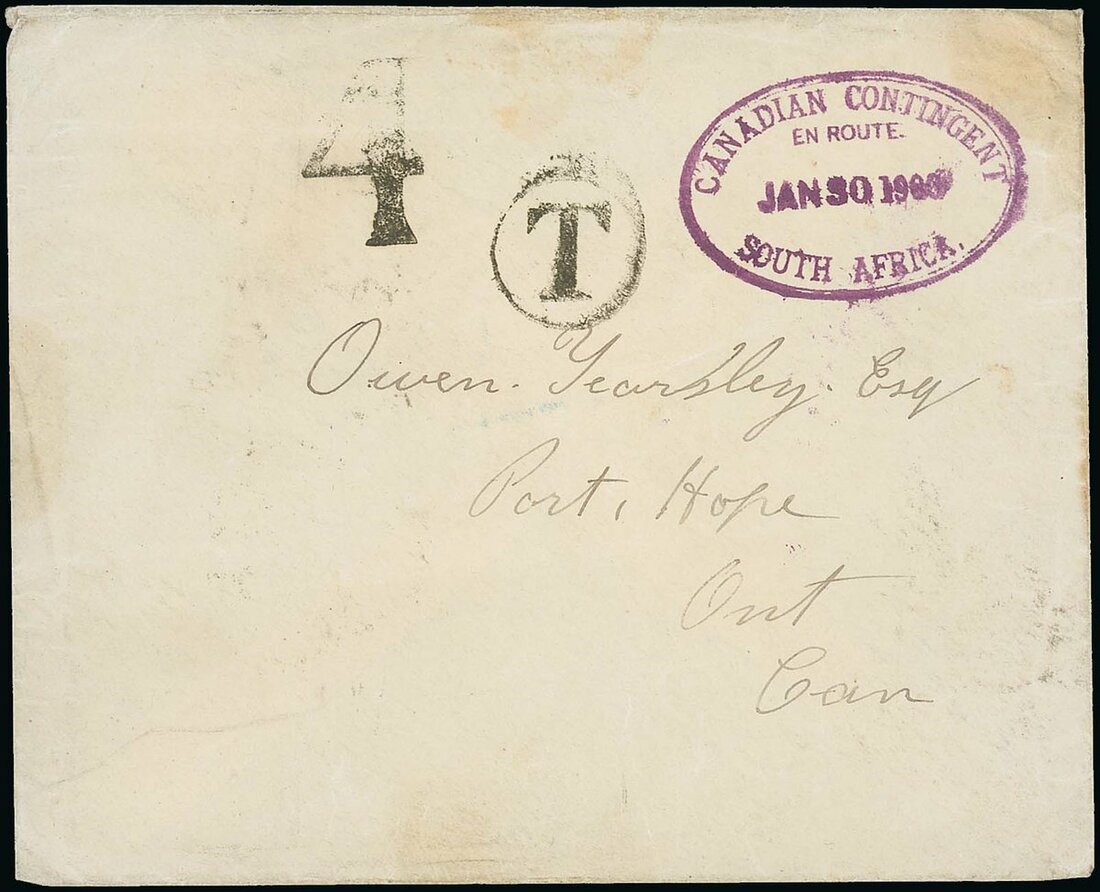 1900 (30 Jan.) stampless envelope to Ontario bearing a superb strike of the Canadian Contingent "