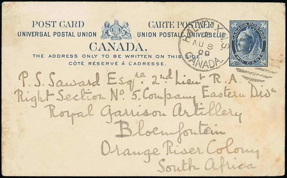 Incoming Mail: 1900 (8 Aug.) Canada 2c. stationery post card to Lt. Saward, "Right Section no.5 Company Eastern Divn, Royal Garrison Artillery, Bloemfontein..." cancelled by Halifax duplex. The Right Section were stationed near Bloemfontein around June to November 1900. Rare. Photo