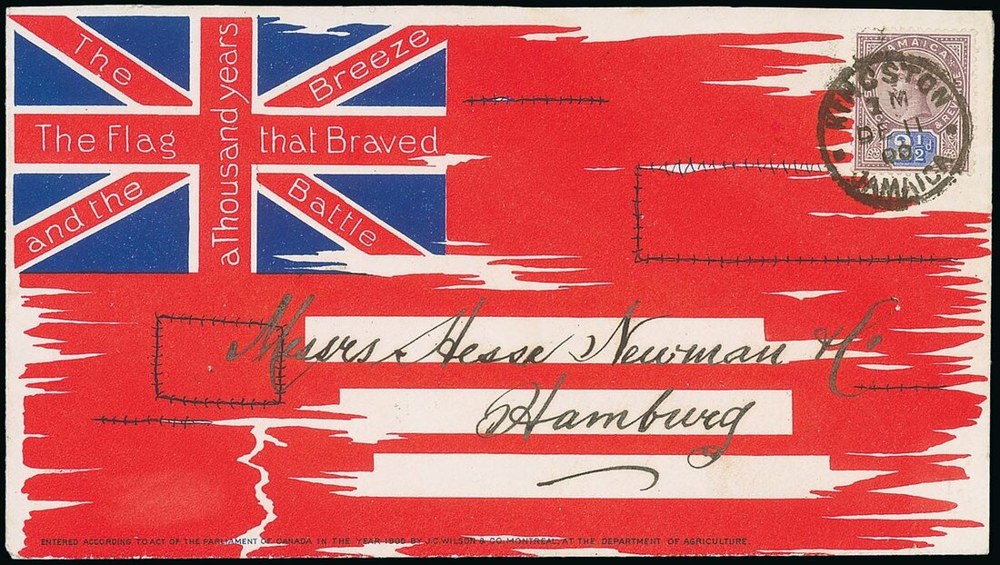 Tattered Ensign: 1900 (11 Dec.) envelope to Hamburg, Germany bearing Jamaica 2½d. franking tied by Kingston c.d.s. with the arrival c.d.s. (28.12) on the reverse and Marchalleck & Co, Morant Bay printed on the flap. Rare. Rowe 50-2. Photo
