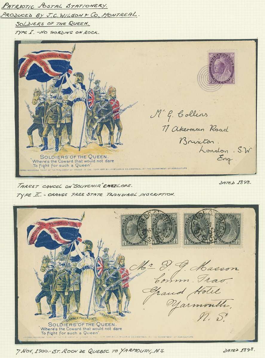 Soldiers of the Queen: With no wording on the rock bearing 2c. violet with souvenir target cancellation; 1900 (7 Nov.) with O.F.S. and Transvaal added to the rock bearing ½c. black (4) tied by St. Rock c.d.s. to Nova Scotia. Rowe 50-7, 50-8. (2 covers)