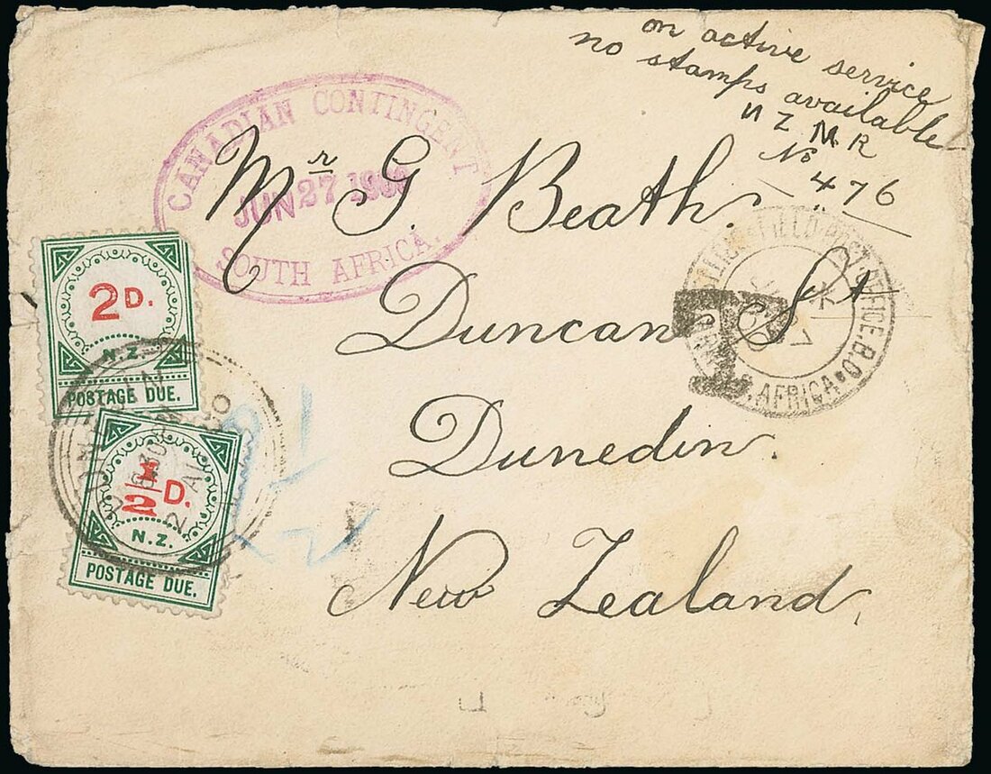 1900 (27 June) stampless envelope to Dunedin "on active service no stamps available NZMR" bearing Field Post Office B.O. c.d.s. overstruck by large "T", Canadian Contingent dated oval (27.6) type II, New Zealand Postage Due ½d. and 2d. (blunt corner) tied by Dunedin c.d.s. (2.8), the reverse with Wellington flag postmark. Also 1900 (Aug.) stampless envelope to Chicago "On Active Service No Stamps available" bearing Field Post Office/1 c.d.s. (Kroonstad) and Canadian Contingent dated oval (13.8) type II in purple with U.S. 2c. Postage Due; no unit indicated. Ex Henry Pattiz. Scarce use of the oval Contingent datestamp on non-Canadian mail. (2 covers). Photo