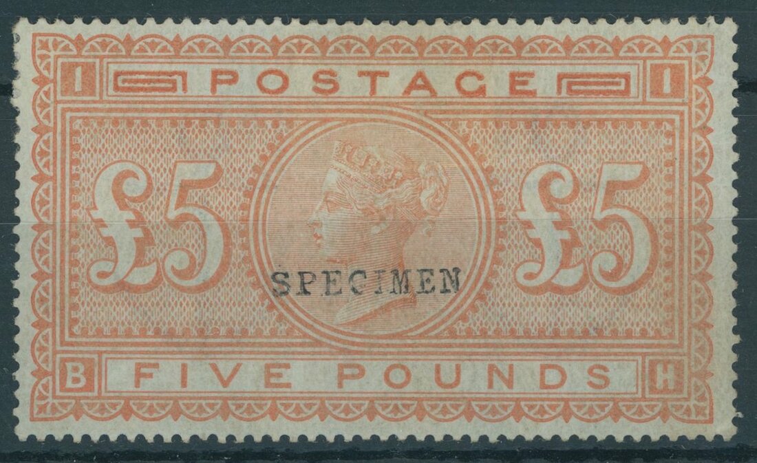 1882 £5 orange on blued paper, lettered BH, overprinted