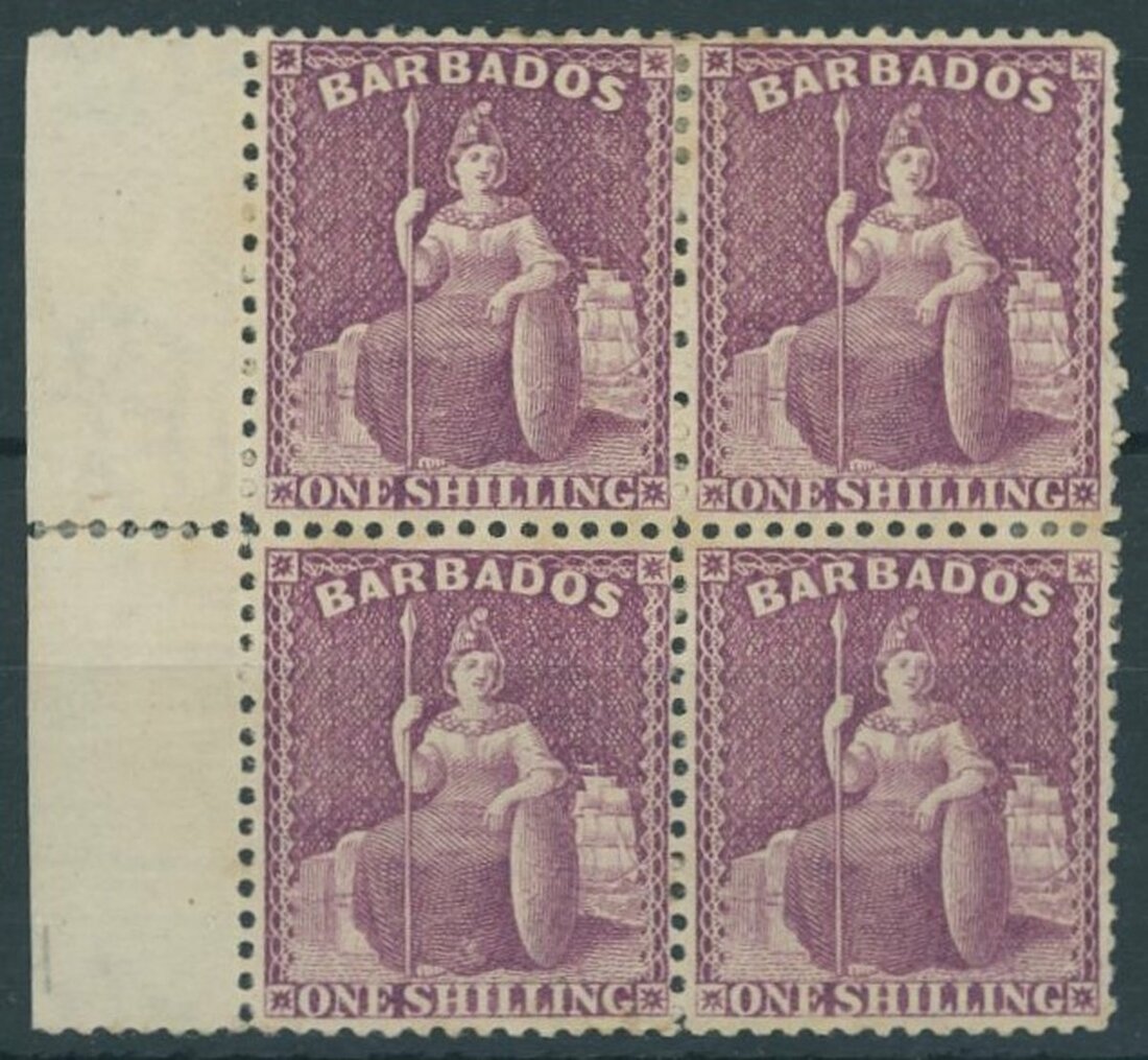 1875-81 perf. 14, 1/- dull mauve, a block of four from the left of the sheet, large part original gum; a very fine and rare multiple. S.G. 83, £2,200+