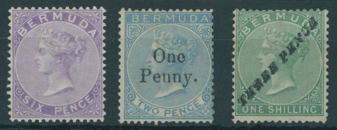 1865-75 Victorian trio comprising 1865-1903 CC perf. 14 6d. dull purple, 1874 3d. on 1/- green (Type 6a) and 1875 1d. on 2d. blue; fine mint. S.G. 6, 13b, 15, £3,500