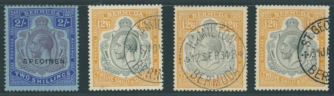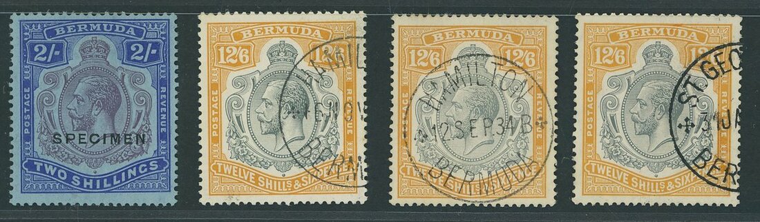1924-32 Script mint and used group (4) comprising 2/- purple and bright blue showing broken crown and scroll also overprinted