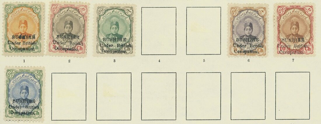 1915 (16 Aug.) mint group on part of an album page (6) comprising 1ch. orange and green, 2ch. sepia and carmine, 3ch. green and grey, 9ch. indigo-lilac and brown, 10ch. brown and carmine and 12ch. blue and green; all hinged to page, good to fine. S.G. £790
