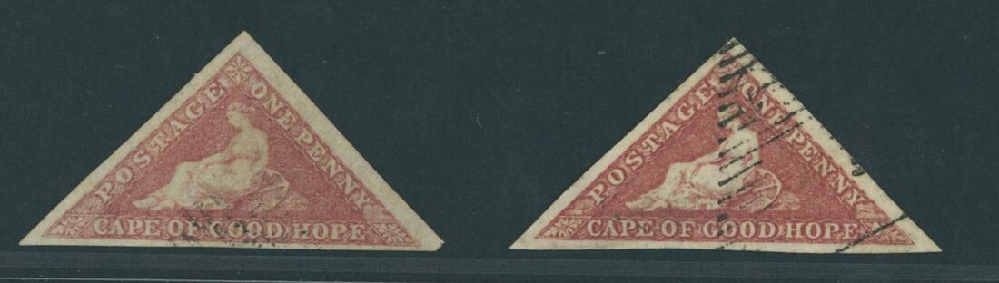 1d. rose, large margins and lightly cancelled at foot and 1d. deep rose-red, large even margins and lightly cancelled at right leaving the design clear; both superb used examples, rare thus. The latter with B.P.A. Certificate (1996). S.G. 5a, 5b, £675
