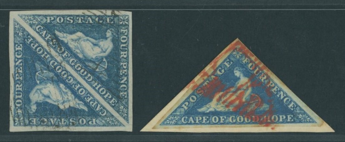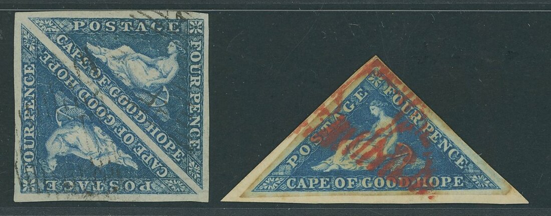 4d. blue on white paper, pair with large even margins and light cancellation; also a single 4d. deep blue example on piece tied by clear part triangular cancellation in bright red; fine. S.G. 6, 6a
