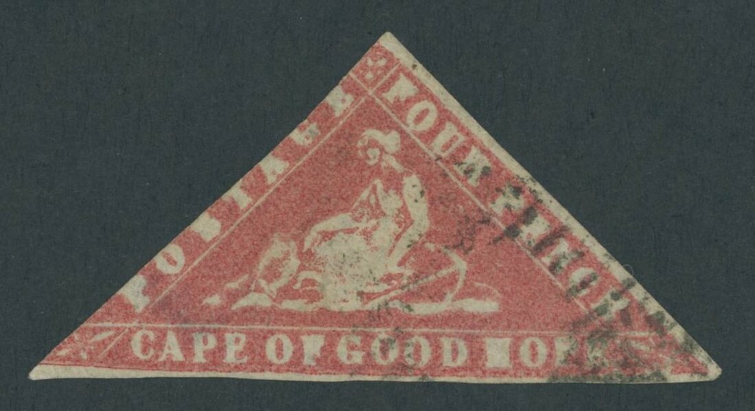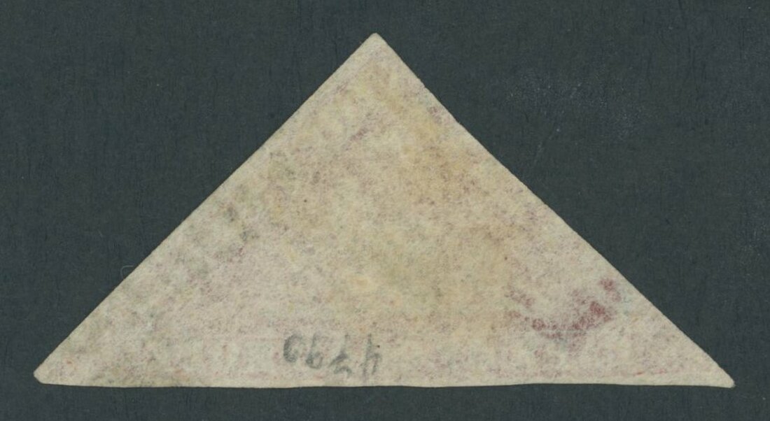 4d. carmine error of colour, good margins on two sides and cut-into and thinned at left, small tear at lower right; lightly cancelled leaving