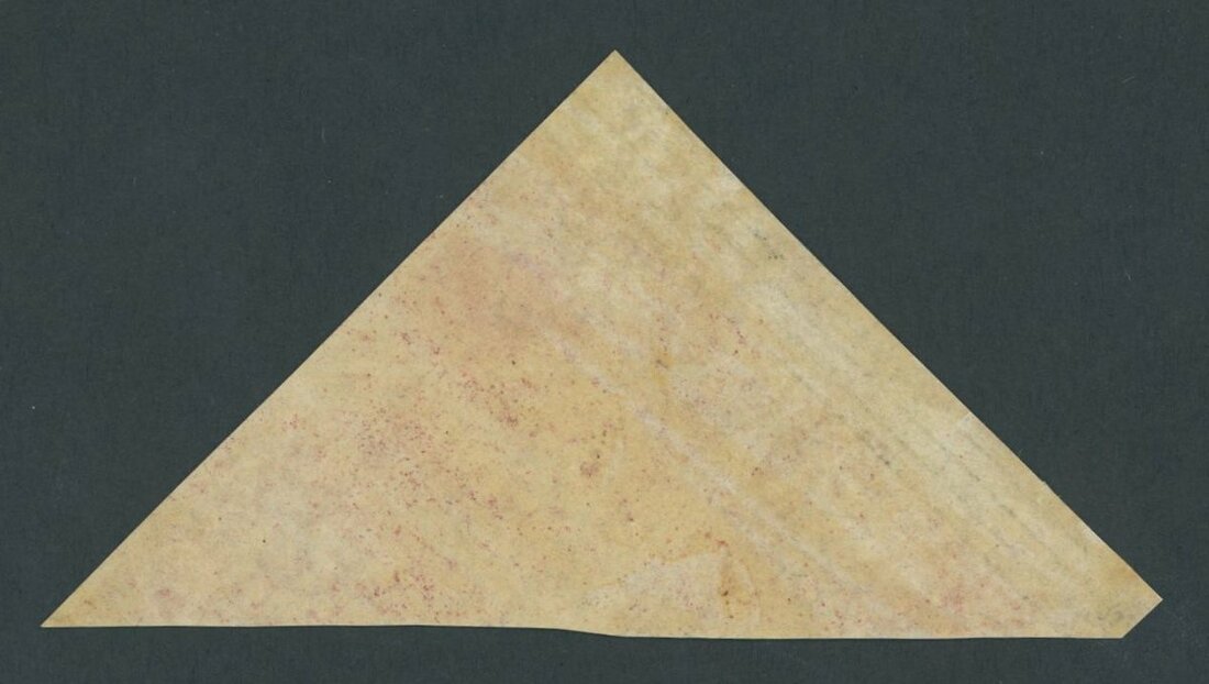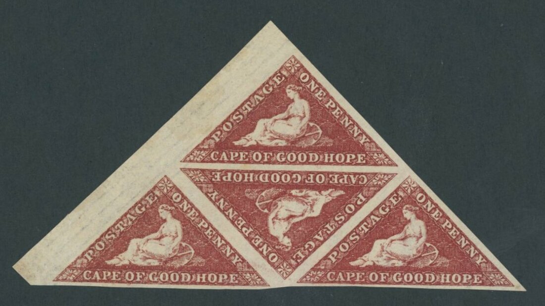 1d. deep carmine red, a triangular block of four from the left of the sheet, large margins elsewhere and with large part original gum; fine. P.F.S.A. Certificate 91980). S.G. 18