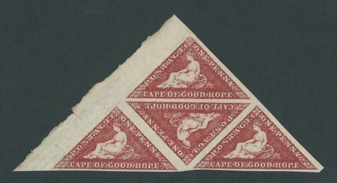 1d. deep carmine-red, a triangular block of four from the left of the sheet, large part original gum; very fine. B.P.A. Certificate (2003). S.G. 18