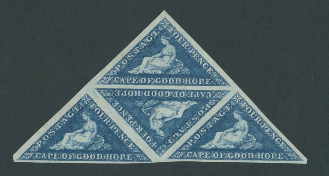 4d. deep blue, rectangular block of four with large even margins; lovely deep colour and with large part original gum, very fine. S.G. 19