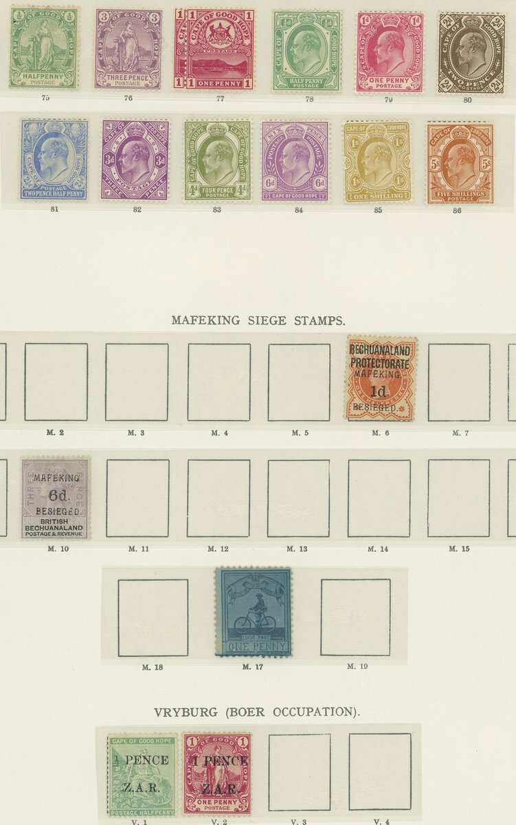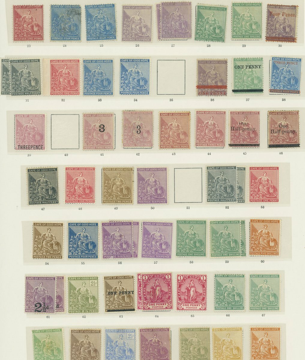 1853-1904 mint collection on pages including 1853 1d. unused (cut-into) and 4d. deep blue used pair (Sismondo Cert.), 1855-63 1d. (2) and 4d. (2), 6d. pale rose-lilac (BPA Cert), 1/- bright yellow-green (RPS Cert.) and deep dark green (2), 1863-64 1d. (2, one with Sismondo Cert.) and 4d. (2, one with BPA Cert), 6d. bright mauve and 1/- pale emerald green (Friedl Cert), a good range of Hope Seated including surcharges and sets to 5/-, 1903-04 set to 5/-, Mafeking Siege with 1d. on ½d. vermilion and 6d. on 3d. purple, 1900 1d. pale blue on blue and Vryburg ½d. and 1d; good to fine