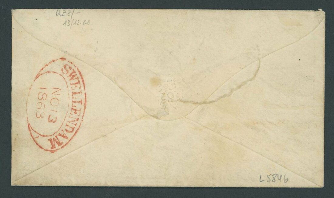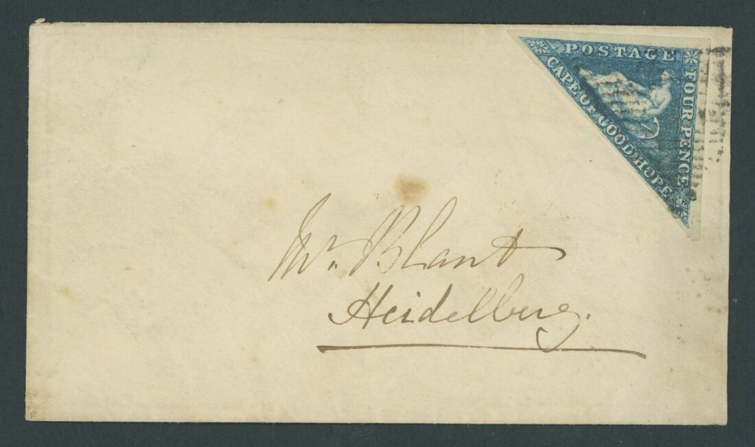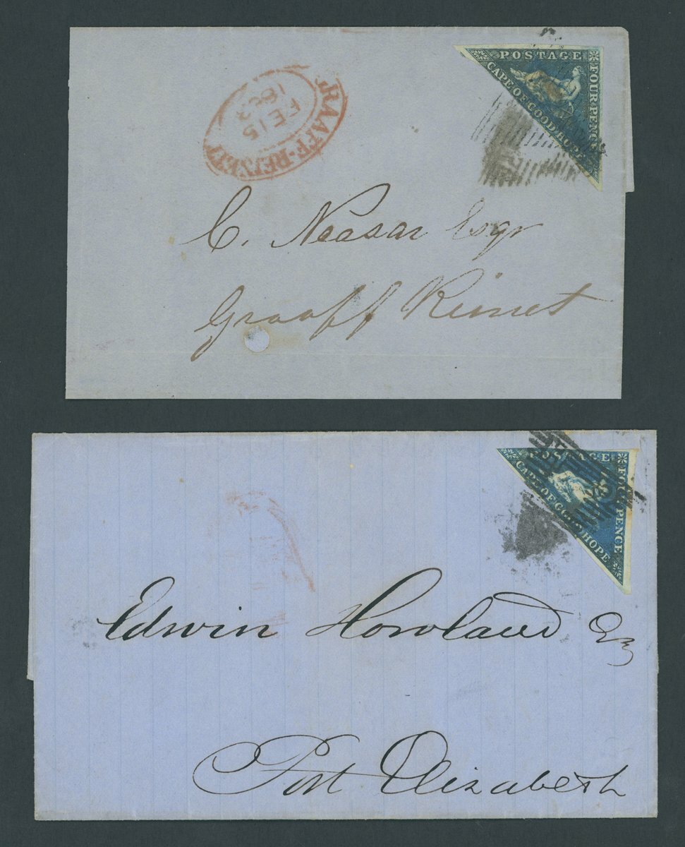 A collection of mainly 1863-64 Triangular types all used on covers, envelopes, etc. (24) including 1865 'Standard Bank of South Africa' cheque bearing 1d., and then twenty-two bearing 4d. blue (one with two examples) and two envelopes bearing 6d. lilac; a good to fine group