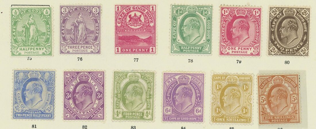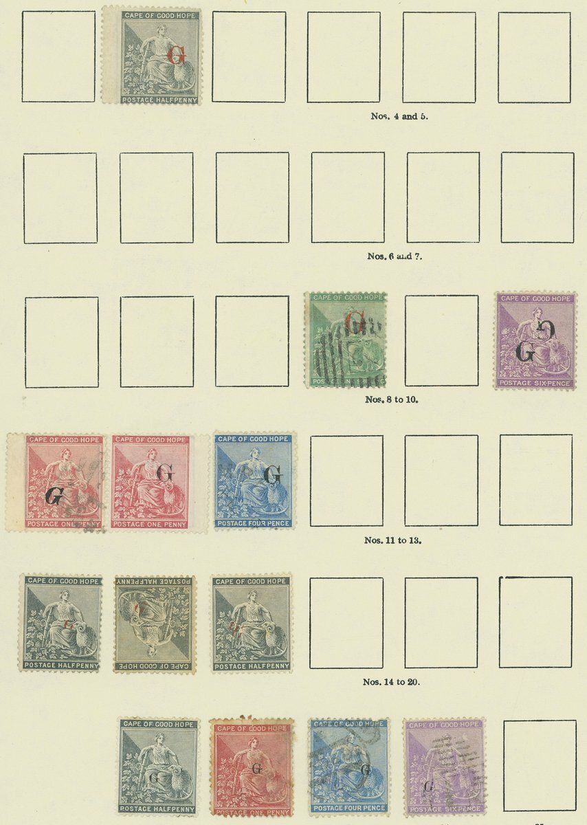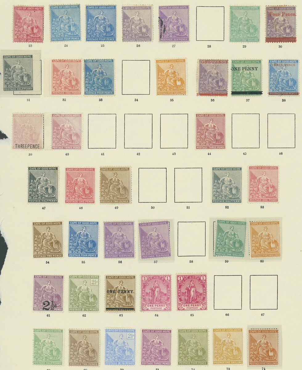 1864-1900 mint collection on album pages of mainly Hope Seated types including 1864-77 1d. to 1/-, 1868 4d. on 6d., 1871-76 ½d. to 5/-, 1874-76 1d. on 6d. and 1d. on 1/-, 1879 and 1880 3d. surcharges, 1884-90 and 1893-98 sets to 5/-, 1902-04 set to 5/-, also Griqualand West with a range of mint and used 'G' overprints (13, including inverted and double); good to fine. S.G. £5,000 (for the Cape)